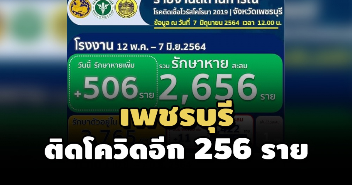 จังหวัดเพชรบุรี ติดโควิดอีก 265 ราย เป็นคลัสเตอร์โรงงาน 11 ราย รวมผู้ติดเชื้อจากการระบาดระลอกใหม่ 7,530 ราย เสียชีวิตสะสม 8 ราย