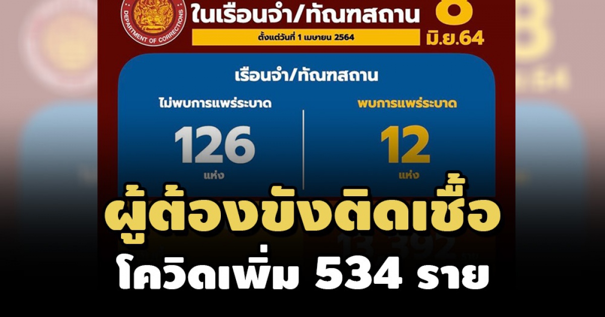 ผู้สื่อข่าวรายงานว่า เมื่อวันที่ 8 มิ.ย.2564 นายอายุตม์ สินธพพันธุ์ อธิบดีกรมราชทัณฑ์ เผยสถานการณ์การแพร่ระบาดของโรคติดเชื้อไวรัสโควิดในเรือนจำและทัณฑสถาน ข้อมูล ณ วันที่ 7 มิ.ย. 2564 เวลา 16.00 น. มีผู้ต้องขังติดเชื้อรายใหม่ จำนวน 534 ราย รักษาหายเพิ่ม 158 ราย เสียชีวิต 3 ราย ทำให้มีผู้ต้องขังติดเชื้อที่ยังอยู่ในการดูแลของกรมราชทัณฑ์ 13,392 ราย