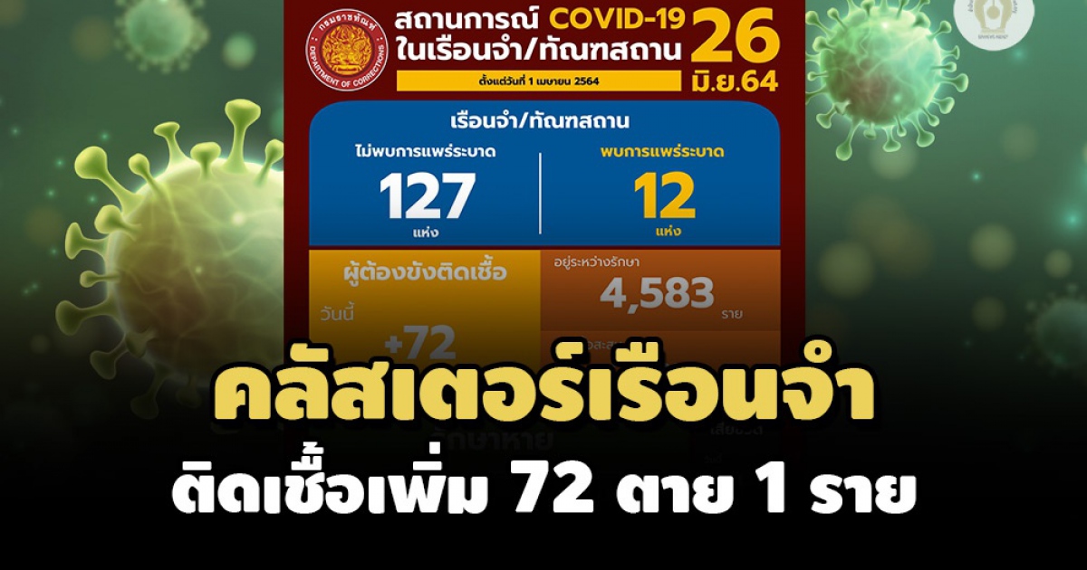 ผู้สื่อข่าวรายงานว่า เมื่วันที่ 26 มิ.ย. 2564 นายอายุตม์ สินธพพันธุ์ อธิบดีกรมราชทัณฑ์ เผยสถานการณ์การแพร่ระบาดของโรคติดเชื้อไวรัสโควิดในเรือนจำและทัณฑสถานมีผู้ต้องขังติดเชื้อรายใหม่ จำนวน 72 ราย รักษาหายวันนี้ 510 ราย เสียชีวิต 1 ราย ทำให้มีผู้ต้องขังติดเชื้อที่ยังอยู่ในการดูแลของกรมราชทัณฑ์ 4,583 ราย