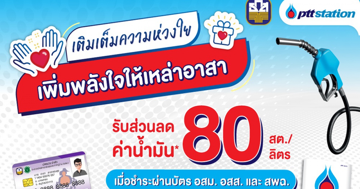 โออาร์ และธ.ก.ส. ขอร่วมส่งกำลังใจ และช่วยลดภาระด้านค่าใช้จ่ายในการเดินทาง เพื่อเป็นขวัญกำลังใจในการปฏิบัติงานให้แก่ อสม. อสส. และ สพฉ. ในแคมเปญ “เติมเต็ม ความห่วงใย เพิ่มพลังใจให้เหล่าอาสา” มอบส่วนลดในการเติมน้ำมันเชื้อเพลิงทุกประเภท ลิตรละ 0.80 บาท ที่สถานีบริการน้ำมัน พีทีที สเตชั่น (PTT Station) กว่า 2,000 สาขาทั่วประเทศ เมื่อชำระผ่านบัตร Smart Card อสม. อสส. และ สพฉ. จำกัดวงเงินท่านละไม่เกิน 1,000 บาท/บัตร/เดือน รวมจำนวนทั้งสิ้น 1,000,000 สิทธิ์ ตั้งแต่วันที่ 1 กรกฎาคม 2564 - 30 กันยายน 2564 หรือจนกว่าจะมีการใช้สิทธิ์เต็มจำนวน โดยเงินส่วนลดจะคืนเข้าบัญชี ธ.ก.ส. ของผู้ถือบัตร Smart Card อสม. อสส. และ สพฉ. ภายใน 45 วัน นับจากวันสิ้นเดือน สอบถามรายละเอียดเพิ่มเติมได้ที่ โทร. 1365 contact center หรือ ธ.ก.ส. Contact Center โทร. 02-555-0555 และ www.baac.or.th