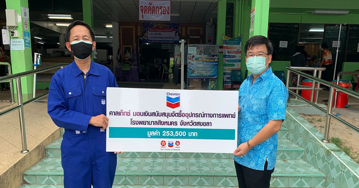 บริษัท เชฟรอน (ไทย) จำกัด ผู้ผลิตและจำหน่ายผลิตภัณฑ์คาลเท็กซ์ นำโดย นายณรงค์ เอี่ยมพงษ์ไพฑูรย์ผู้จัดการคลังน้ำมันร่วมสงขลา (ซ้าย) มอบเงินสนับสนุนในการจัดซื้ออุปกรณ์ทางการแพทย์ที่จำเป็น จำนวน 253,500 บาท ให้แก่ โรงพยาบาลสิงหนคร อำเภอสิงหนคร จังหวัดสงขลา เพื่อใช้ประโยชน์ตามวัตถุประสงค์ของโรงพยาบาล โดยมี นายแพทย์นครินทร์ ฉินตระกูลประดับ รักษาการในตำแหน่ง ผู้อำนวยการโรงพยาบาลสิงหนคร (ขวา) เป็นตัวแทนรับมอบ ณ โรงพยาบาลสิงหนคร จังหวัดสงขลา เมื่อเร็ว ๆ นี้