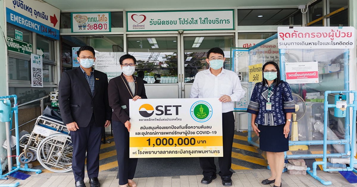 ตลาดหลักทรัพย์แห่งประเทศไทย มอบการสนับสนุนห้องแยกป้องกันเชื้อความดันลบและอุปกรณ์การแพทย์เพื่อรักษาผู้ป่วย COVID-19 มูลค่า 1,000,000 บาท ให้แก่โรงพยาบาลลาดกระบังกรุงเทพมหานคร โดยมี อัญญาชลี กมเลศร์ รองผู้อำนวยการ ฝ่ายบริหารกิจกรรมเพื่อสังคม ตลาดหลักทรัพย์ฯ เป็นตัวแทนส่งมอบแก่ นพ. เอกชัย ผดุงภักดีวงศ์ รองผู้อำนวยการโรงพยาบาล ฝ่ายการแพทย์ โรงพยาบาลลาดกระบังกรุงเทพมหานคร ทั้งนี้ ตลาดหลักทรัพย์ฯ มุ่งเป็นส่วนหนึ่งในการบรรเทาความเดือดร้อนแก่ประชาชนจากสถานการณ์ของ COVID-19 และให้การสนับสนุนแก่องค์กรและหน่วยงานที่ทำหน้าที่ดูแลประชาชนจนกว่าสถานการณ์จะคลี่คลาย