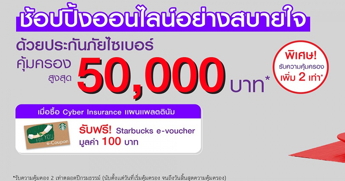พิเศษ! สำหรับลูกค้าที่ซื้อผลิตภัณฑ์ประกันภัยไซเบอร์ (Cyber Insurance) ผ่าน MONLINE.COM จะได้รับความคุ้มครองเพิ่ม 2 เท่าตลอดปีกรมธรรม์ และรับฟรี! Starbucks e-voucher มูลค่า 100 บาท เมื่อซื้อประกันภัยไซเบอร์แผนแพลตตินัม และชำระค่าเบี้ยประกันผ่านบัตรเครดิต SCB M VISA ระหว่างวันที่ 1 กรกฎาคม 2564 – 31 สิงหาคม 2564