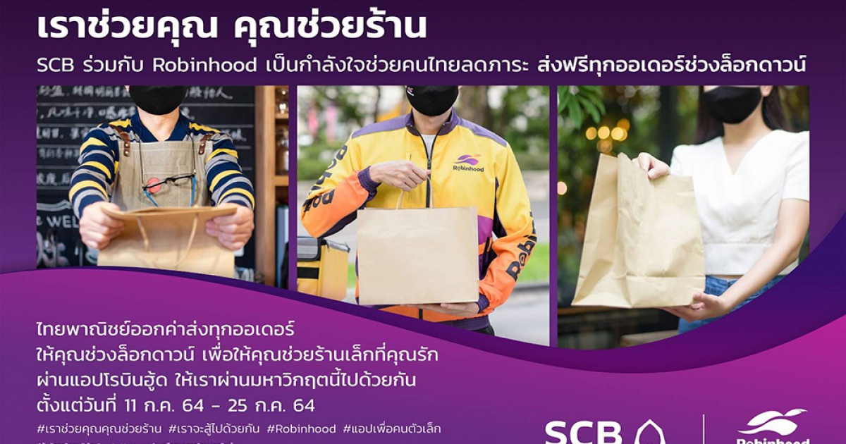 “ธนาคารไทยพาณิชย์” ตระหนักถึงความกังวลและความเดือดร้อนของสังคมไทยที่มีต่อสถานการณ์การแพร่ระบาดของโควิด-19 ที่กำลังทวีความเข้มข้น จึงได้ร่วมกับ “โรบินฮู้ด” แพลตฟอร์มฟู้ดเดลิเวอรีสัญชาติไทย ในเครือธนาคารฯ ออกมาตรการพิเศษ “ส่งฟรีทุกออเดอร์ช่วงล็อกดาวน์” ตั้งแต่วันที่ 11 – 25 กรกฎาคม 2564 รวม 15 วัน เพื่อช่วยบรรเทาความเดือดร้อนของผู้คนในสังคม ช่วยลดภาระค่าใช้จ่ายให้กับลูกค้าด้วยการออกค่าส่งอาหารให้ฟรีทุกออเดอร์ มุ่งหวังช่วยร้านอาหารโดยเฉพาะร้านเล็ก ๆ ให้มีออเดอร์มีรายได้ในการพยุงธุรกิจ รวมถึงเพิ่มโอกาสในการสร้างงานที่เพิ่มขึ้นให้กับไรเดอร์ หวังให้มาตรการพิเศษในครั้งนี้ จะเป็นจุดเริ่มต้นของโมเดลที่ “คนตัวใหญ่” จะสามารถมีส่วนช่วยเหลือสังคมและต่อลมหายใจให้ “คนตัวเล็ก” สามารถผ่านพ้นช่วงเวลาที่ยากลำบากได้อีกครั้ง