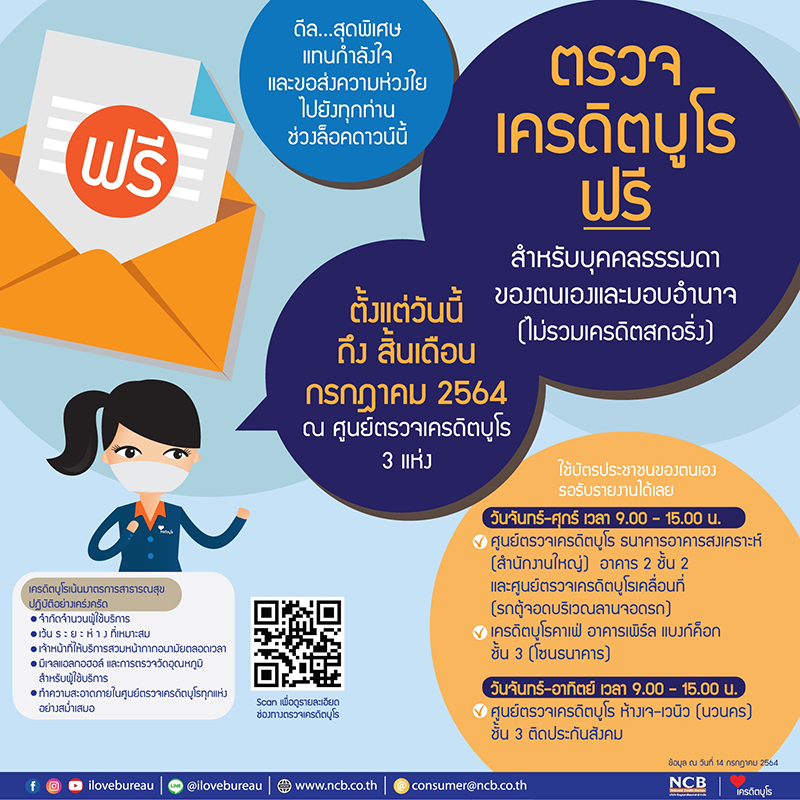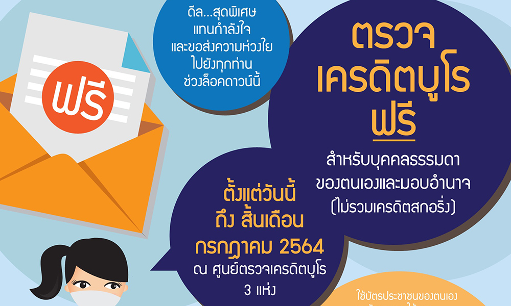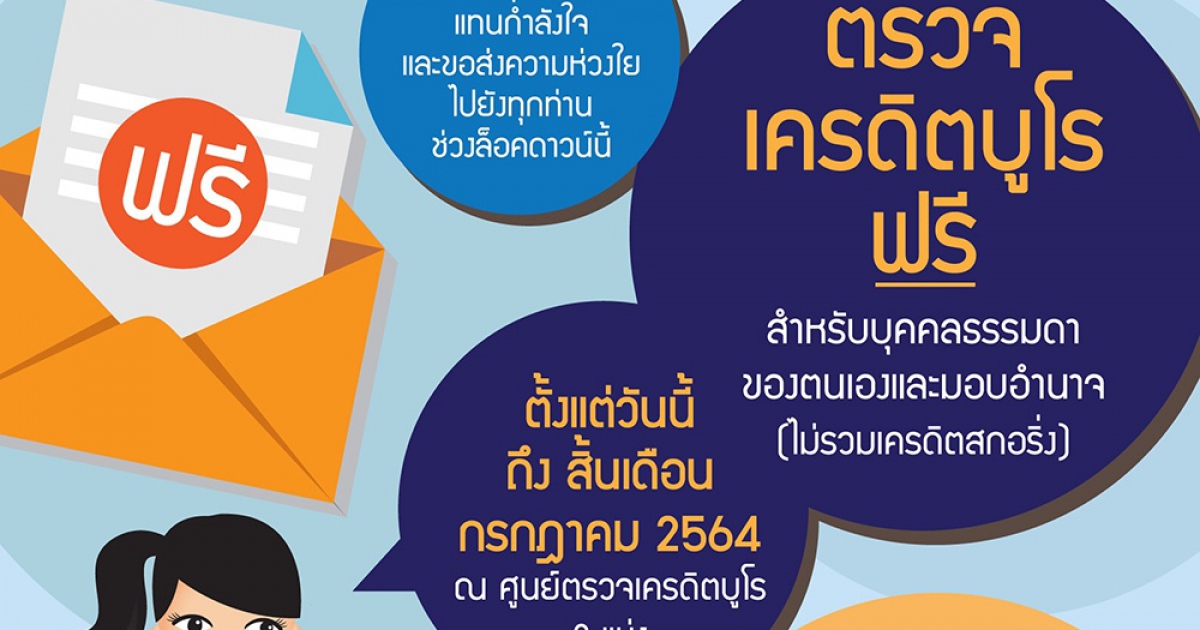 ด้วยบริการตรวจเครดิตบูโร ฟรี!❣️สำหรับบุคคลธรรมดา ของตนเองและมอบอำนาจ (ไม่รวมเครดิตสกอริ่ง) ตั้งแต่วันนี้ - สิ้นเดือนกรกฎาคม 2564 ณ ศูนย์ตรวจเครดิตบูโร 3 แห่ง