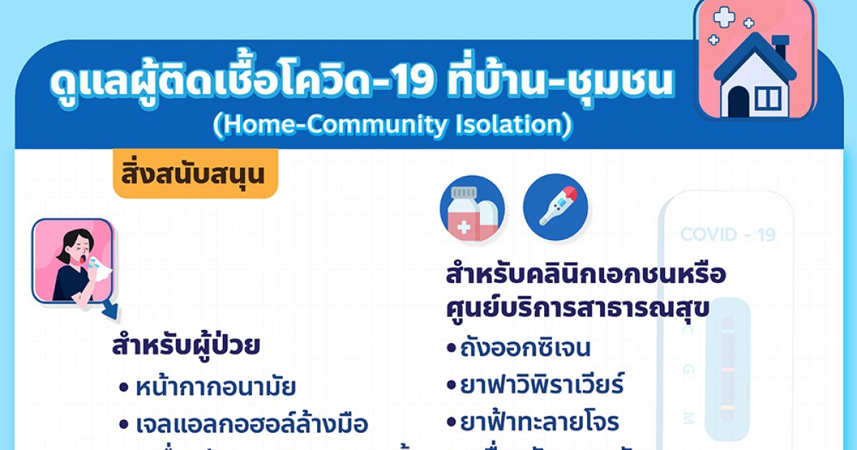 สำหรับขั้นตอนการดูแลผู้ติดเชื้อโควิด-19 ที่บ้านหรือที่ชุมชน ก็จะยึดแนวทางของกรมการแพทย์และ สปสช.เป็นหลัก คือผู้ป่วยจะได้รับหน้ากากอนามัย เจลแอลกอฮอล์ล้างมือ เครื่องวัดออกซิเจนปลายนิ้ว และปรอทวัดไข้แบบดิจิทัล สำหรับกักตัวที่บ้าน 14 วัน พร้อมอาหารวันละ 3 มื้อ โดยแพทย์จะวิดีโอคอลติดตามอาการผ่านโปรแกรม AMED Telehealth ซึ่งเป็นระบบบริการทางการแพทย์ทางไกลของสำนักงานพัฒนาวิทยาศาสตร์และเทคโนโลยีแห่งชาติ (สวทช.)