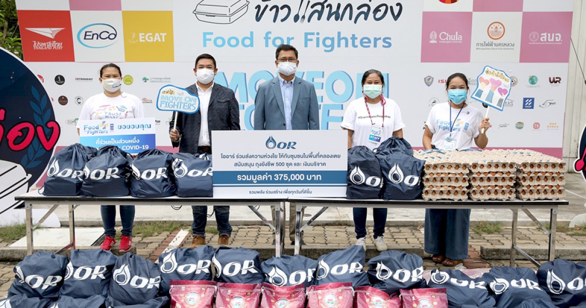 นายสุนทร เชื้อสุข รองกรรมการผู้จัดการใหญ่ปฏิบัติการคลังปิโตรเลียม บริษัท ปตท. น้ำมันและการค้าปลีก จำกัด (มหาชน) หรือ โออาร์ เปิดเผยว่า ปัจจุบันประเทศไทยต้องเผชิญกับการแพร่ระบาดของโรคโควิด-19 ซึ่งส่งผลกระทบต่อชีวิตความเป็นอยู่ของประชาชนเป็นอย่างมาก โออาร์ ตระหนักถึงความสำคัญของภารกิจที่โครงการ Food for Fighters “ศูนย์ข้าวเพื่อหมอ” ได้ดำเนินการเพื่อสนับสนุนการปฏิบัติภารกิจในการดูแลผู้ป่วยโควิด-19 ของบุคลากร อาสาสมัคร ตลอดจนช่วยเหลือประชาชนที่อยู่ในชุมชนแออัดและกลุ่มเปราะบางที่ได้รับความเดือดร้อน จึงได้มอบเงินบริจาคภายใต้โครงการ “ส่งกำลังใจ .. สู้ไปด้วยกัน” (#ORStayStrongTogether) ให้กับ Food for Fighters “ศูนย์ข้าวเพื่อหมอ” สำหรับนำไปใช้ซื้อข้าวสาร จำนวน 500 ถุง และไข่ไก่ จำนวน 500 แผง สนับสนุนการดำเนินงานของโครงการ อีกทั้งยังได้มอบถุงยังชีพ จำนวน 500 ถุง สำหรับบรรเทาความเดือดร้อนให้ชุมชนในพื้นคลองเตย 5 ชุมชน ได้แก่ ชุมชนบ้านมั่นคง ชุมชนริมคลองวัดสะพาน ชุมชนวัดไผ่สิงโต ชุมชนพัฒนาใหม่ และชุมชน 70 ไร่ ซึ่งเป็นชุมชนที่อยู่ในบริเวณใกล้เคียงกับสำนักงานพระโขนง คลังน้ำมันพระโขนง และคลังปิโตรเลียมบางจากของโออาร์ รวมมูลค่าทั้งสิ้น 375,000 บาท ซึ่งสอดคล้องกับแนวทางการดำเนินธุรกิจของโออาร์ ที่มุ่งเน้นการดูแลคุณภาพชีวิตของชุมชน ร่วมสร้างชุมชนน่าอยู่ และเติบโตร่วมกันอย่างยั่งยืน