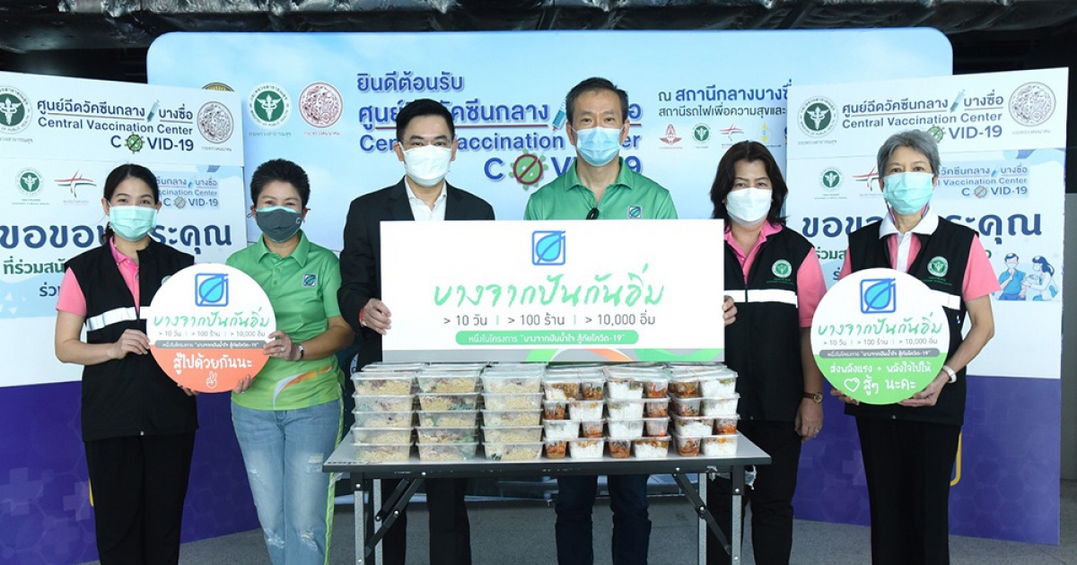 นายชัยวัฒน์ โควาวิสารัช ประธานเจ้าหน้าที่บริหารและกรรมการผู้จัดการใหญ่ บริษัท บางจาก คอร์ปอเรชั่น จำกัด (มหาชน) ส่งมอบอาหาร 500 กล่อง ในโครงการ “บางจากฯ ปันกันอิ่ม >10 วัน >100 ร้าน >10,000 อิ่ม” ให้กับนายสรพงศ์ ไพฑูรย์พงษ์ รองปลัดกระทรวงคมนาคม ณ จุดฉีดวัคซีนกลางบางซื่อ โดยโครงการนี้จัดขึ้นเพื่อสนับสนุนผู้ประกอบการร้านอาหารรายย่อย และร้านพันธมิตรสถานีบริการน้ำมันบางจาก นำอาหารไปมอบให้บุคลากรทางการแพทย์และอาสาสมัครที่ปฏิบัติภารกิจด้านสาธารณสุข รวมถึงประชาชนทั่วไปที่โรงพยาบาล โรงพยาบาลสนาม ศูนย์ฉีดวัคซีน ศูนย์พักคอย ชุมชน ฯลฯ ในพื้นที่กรุงเทพฯ และปริมณฑล วันละอย่างต่ำ 1,000 คน จนถึงวันที่ 31 กรกฎาคม 2564