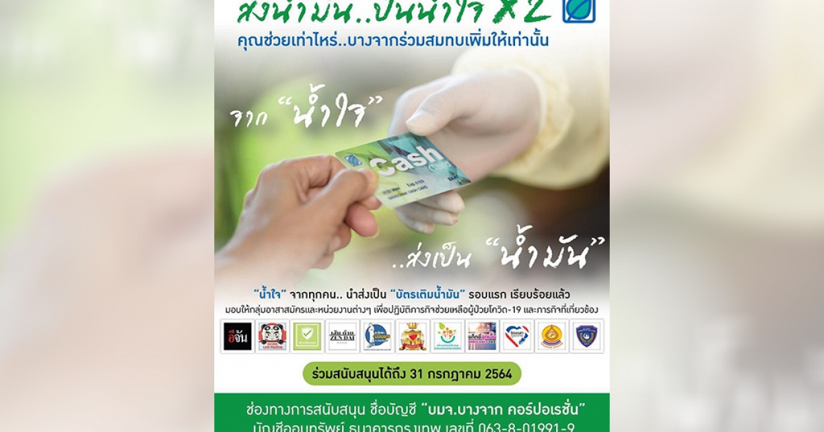 บางจากฯ เชิญชวนสนับสนุนบัตรเติมน้ำมันให้กับทีมจิตอาสาต่างๆ ที่ปฏิบัติภารกิจสู้ภัยโควิด-19 อยู่อย่างหนักหน่วงในช่วงนี้ ผ่านโครงการ “ส่งน้ำมัน ปันน้ำใจ x2” คุณช่วยเท่าไหร่ บางจากสนับสนุนเท่านั้น ระหว่างวันที่ 16-31 กรกฎาคมนี้ สนับสนุนน้ำมันที่ใช้เติมรถส่งผู้ป่วยไปรับการรักษาที่โรงพยาบาล ส่งผู้ป่วยที่รักษาหายแล้วกลับบ้าน ส่งผู้ป่วยกลับไปรักษาที่ภูมิลำเนา ไปจนถึงส่งผู้เสียชีวิตไปวัด และน้ำมันที่ใช้ในการฌาปนกิจ ให้กับกลุ่มอาสาสมัครและหน่วยงานต่างๆ เช่น เพจอีจัน: ส่งผู้ป่วยไปรักษาที่ภูมิลำเนา หมอแล็บแพนด้า: ช่วยหาเตียง/ตรวจหาเชื้อ/รับ-ส่งผู้ป่วย เราต้องรอด: ช่วยหาเตียง/รับ-ส่งผู้ป่วย เส้นด้าย: รับส่งผู้ป่วยตรวจหาเชื้อและรักษา/ช่วยเหลือคนกักตัว/รับส่งศพ รถพยาบาลอาสาวัยรุ่นนิมิบุตร: รับ-ส่งผู้ป่วย องค์กรทำดี: รับ-ส่งผู้ป่วย ดูแลผู้ป่วยรักษาตัวที่บ้าน ส่งอาหารและของจำเป็นให้แคมป์คนงาน ใจถึงใจคนไทยไม่ทิ้งกัน: ส่งอาหารและของจำเป็นให้แคมป์คนงานจิตอาสาดูแลไทย: สร้าง Digital Map Platform ประสานงานการรับส่งผู้เสียชีวิตไปประกอบพิธีทางศาสนาสร้างสรรค์สังคม: รับ-ส่งผู้ป่วยไปรักษาที่ภูมิลำเนาโครงการแท็กซี่ฉุกเฉิน: รับ-ส่งผู้ป่วยโดยไม่คิดค่าใช้จ่าย