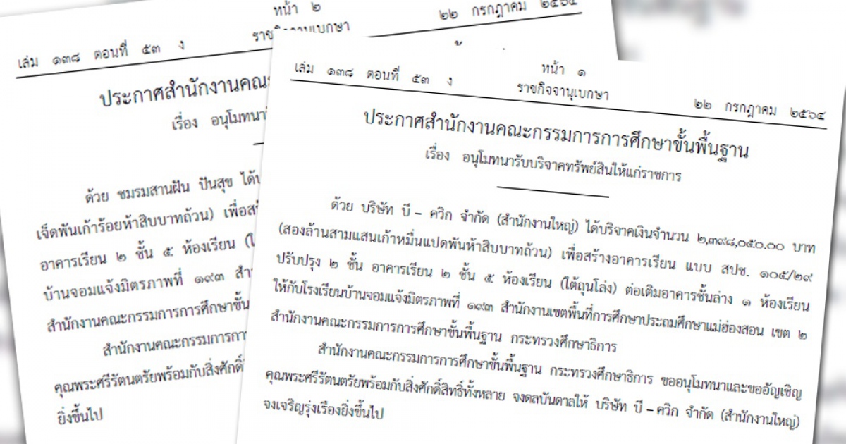สำนักข่าวอิศรา (www.isranews.org) วันที่ 22 ก.ค.2564 เผยแพร่ประกาศสำนักงานคณะกรรมการการศึกษาขั้นพื้นฐานเรื่อง อนุโมทนารับบริจาคทรัพย์สินให้แก่ราชการ ได้แก่