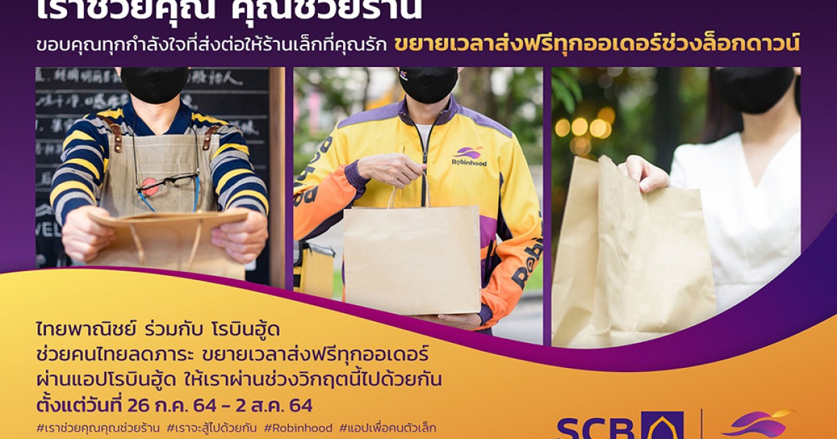 “ธนาคารไทยพาณิชย์” และ “โรบินฮู้ด” แพลตฟอร์มฟู้ดเดลิเวอรีสัญชาติไทย ในเครือธนาคารฯ ตระหนักถึงความเดือดร้อนของสังคมไทยที่มีต่อสถานการณ์โควิด-19 โดยเฉพาะอย่างยิ่งในช่วงล็อกดาวน์ที่เศรษฐกิจหยุดชะงัก จึงได้ขยายระยะเวลามาตรการ “เราช่วยคุณ คุณช่วยร้าน” ส่งฟรีทุกออเดอร์ต่ออีก 8 วัน ตั้งแต่วันที่ 26 กรกฎาคม – 2 สิงหาคม 2564 มุ่งหวังช่วยร้านเล็กให้รอด ไรเดอร์มีงานมีรายได้ ลดภาระค่าใช้จ่ายให้กับลูกค้า รวมถึงชวนคนในสังคมร่วมแบ่งปันและส่งต่อกำลังใจให้กันและกันในช่วงเวลาที่ยากลำบากเช่นนี้