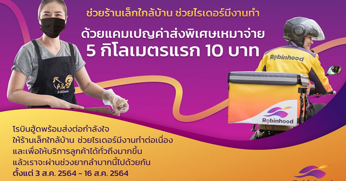 “โรบินฮู้ด” แพลตฟอร์มฟู้ดเดลิเวอรีสัญชาติไทย มุ่งมั่นช่วยเหลือ “คนตัวเล็ก” อย่างต่อเนื่อง ล่าสุดส่งแคมเปญใหม่ “เหมาจ่ายค่าส่งอัตราพิเศษ 5 กิโลเมตรแรก 10 บาท” เป็นระยะเวลา 14 วัน ตั้งแต่วันที่ 3-16 สิงหาคม 2564 เพิ่มเติมจากนโยบายหลักของโรบินฮู้ดที่ไม่เก็บ GP ร้านค้า หวังช่วยต่อลมหายใจร้านเล็กให้มีออเดอร์ มีรายได้พยุงธุรกิจในช่วงเวลาที่ยากลำบาก เพิ่มโอกาสในการสร้างงานสร้างรายได้ให้กับไรเดอร์ รวมถึงสามารถให้บริการลูกค้าได้ทั่วถึงมากยิ่งขึ้น