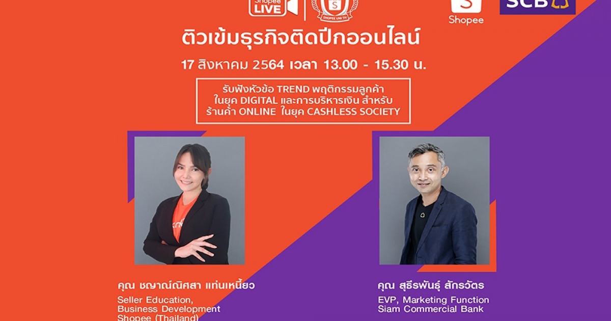 ธนาคารไทยพาณิชย์ มุ่งมั่นเคียงข้างและให้ความช่วยเหลือแก่ผู้ประกอบการรายย่อย ผ่านการพัฒนาบริการและโซลูชันทางการเงินที่หลากหลายและตอบโจทย์ในทุกการทำธุรกิจเพื่อสร้างรายได้ที่เพิ่มมากขึ้น พร้อมเพิ่มโอกาสให้ผู้ประกอบการธุรกิจออนไลน์สามารถเข้าถึงสินเชื่อได้อย่างต่อเนื่อง ล่าสุดจับมือ บริษัท ช้อปปี้ (ประเทศไทย) จำกัด (Shopee) ผู้นำอีคอมเมิร์ซแพลตฟอร์มในภูมิภาคเอเชียตะวันออกเฉียงใต้และไต้หวัน เตรียมจัดงานสัมมนาสุดเอ็กซ์คลูซีฟ “Shopee University: Financial Edition Virtual Livestream 2021” ติวเข้มธุรกิจติดปีกออนไลน์ ผ่านช่องทางออนไลน์ แก่ผู้ประกอบการรายย่อย และพ่อค้าแม่ค้าออนไลน์ในช้อปปี้ (Online seller) ซึ่งจัดขึ้นเป็นปีที่ 2 หลังจากได้รับการตอบรับอย่างท่วมท้นในครั้งที่ผ่านมา ภายในงานขนทัพวิทยากรชื่อดัง พร้อมกูรูด้านการตลาด ได้แก่ คุณสุธีรพันธุ์ สักรวัตร ผู้ช่วยผู้จัดการใหญ่ ผู้บริหารสายงานการตลาด ธนาคารไทยพาณิชย์ และคุณชญาณ์ณิศสา แท่นเหนี้ยว Seller Education, Business Development บริษัท ช้อปปี้ (ประเทศไทย) จำกัด มาร่วมพูดคุย เจาะลึกทุกประเด็นสำคัญ พร้อมเสริมทักษะการทำธุรกิจบนแพลตฟอร์มออนไลน์ในยุค New Normal ที่เติบโตขึ้นอย่างรวดเร็ว ครอบคลุมเทรนด์พฤติกรรมผู้บริโภคที่น่าสนใจในยุค Digital, วิธีบริหารเงินสำหรับร้านค้าออนไลน์ในยุคสังคมไร้เงินสด (Cashless Society) รวมถึงวิเคราะห์พฤติกรรมใช้จ่ายของคนไทยโดยไม่พึ่งเงินสด และการบริหารเงิน “ส่วนเกิน” และ “ส่วนขาด” เป็นต้น พร้อมแนะนำผลิตภัณฑ์ทางการเงินของธนาคารที่ตอบโจทย์การค้าขายของร้านค้าออนไลน์ในยุคสังคมไร้เงินสด ครอบคลุมทุกโซลูชันการเงินอันทันสมัยที่สามารถนำไปต่อยอดในการดำเนินธุรกิจได้ เช่น สินเชื่อมณีทันใจ เพื่อธุรกิจ, แอปแม่มณี, มณี Free Solution และ มณีมั่งคั่ง รวมไปถึงสินเชื่อสำหรับผู้ประกอบการรายย่อย เป็นต้น สำหรับผู้ประกอบการที่สนใจสามารถร่วมเข้าฟังสัมมนาฟรี! ในวันอังคารที่ 17 สิงหาคม 2564 ตั้งแต่เวลา 13.00 – 15.30 น. ผ่านทางแอปพลิเคชันช้อปปี้ โดยธนาคารมุ่งหวังให้การจัดงานสัมมนาในครั้งนี้จะสามารถช่วยเตรียมความพร้อมให้กลุ่มผู้ประกอบการรายย่อยสามารถปรับตัว พยุงธุรกิจให้สามารถก้าวข้ามผ่านช่วงเวลาที่ท้าทายเช่นนี้ไปได้ และกลับมามีรอยยิ้มอีกครั้ง
