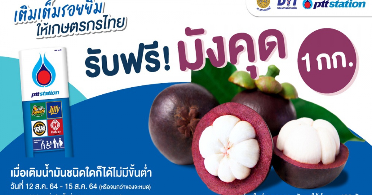 บริษัท ปตท. น้ำมันและการค้าปลีก จำกัด (มหาชน) (โออาร์) ร่วมกับกรมการค้าภายใน กระทรวงพาณิชย์ จัดโครงการ พีทีที สเตชั่น เติมเต็มรอยยิ้มให้เกษตรกรไทย เพื่อบรรเทาความเดือดร้อนของเกษตรกรชาวสวนมังคุด โดยรับซื้อมังคุดจำนวน 100,000 กิโลกรัมจากเกษตรกรชาวสวนมังคุด จ.นครศรีธรรมราช ซึ่งประสบปัญหาจากการแพร่ระบาดของโรคโควิด-19 ทำให้ไม่มีช่องทางระบายสินค้า เป็นผลให้มีผลผลิตล้นตลาดและราคาตกต่ำ และส่งต่อรอยยิ้มโดยนำมังคุดมามอบให้ผู้ใช้บริการ พีทีที สเตชั่น ที่เติมน้ำมันชนิดใดก็ได้ไม่มีขึ้นต่ำ ระหว่างวันที่ 12 -15 สิงหาคม 2564 ณ สถานีบริการน้ำมัน พีทีที สเตชั่น 218 แห่ง ในพื้นที่กรุงเทพมหานครและนนทบุรี รับฟรี มังคุด 1 กก. พร้อมกันนี้ โออาร์ ยังได้ส่งมอบมังคุดจำนวน 10,000 กิโลกรัม ให้กับ หน่วยงาน โรงพยาบาล องค์กรเอกชน กลุ่มจิตอาสาต่าง ๆ และศูนย์พักคอยของกรุงเทพมหานคร รวมทั้งสิ้น 79 แห่ง เพื่อสนับสนุนการดำเนินการและเป็นขวัญและกำลังใจในการปฏิบัติหน้าที่ของเจ้าหน้าที่และอาสาสมัครอีกด้วย ผู้สนใจสอบถามรายละเอียดเพิ่มเติมได้ที่ โทร. 1365 Contact Center