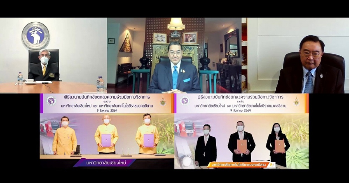 วันที่ 9 ส.ค. 2564 ศาสตราจารย์พิเศษ ดร.สุรเกียรติ์ เสถียรไทย นายกสภามหาวิทยาลัยเทคโนโลยีราชมงคลอีสาน ได้ร่วมเป็นสักขีพยานในพิธีลงนามบันทึกข้อตกลงความร่วมมือทางวิชาการระหว่างมหาวิทยาลัยเชียงใหม่และมหาวิทยาลัยเทคโนโลยีราชมงคลอีสาน ผ่านระบบออนไลน์ (Zoom Meeting) โดยรองศาสตราจารย์ ดร.โฆษิต ศรีภูธร รักษาราชการแทนอธิการบดีมหาวิทยาลัยเทคโนโลยีราชมงคลอีสาน และศาสตราจารย์คลินิก นายแพทย์นิเวศน์ นันทจิต อธิการบดีมหาวิทยาลัยเชียงใหม่ ร่วมลงนาม และได้รับเกียรติจากศาสตราจารย์เกียรติคุณ นายแพทย์อาวุธ ศรีศุกรี อุปนายกสภามหาวิทยาลัยเชียงใหม่ และ ดร.สรจักร เกษมสุวรรณ อุปนายกสภามหาวิทยาลัยเทคโนโลยีราชมงคลอีสาน เป็นพยานในพิธีลงนามความร่วมมือ