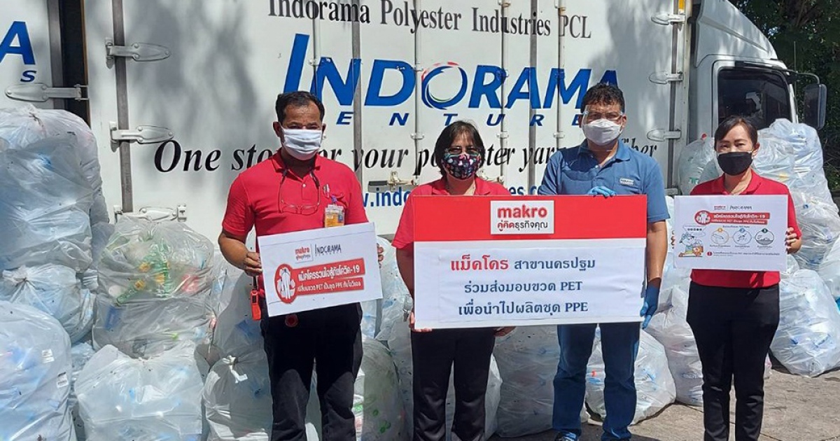 “แม็คโครได้เปิดจุดรับบริจาคขวดน้ำพลาสติกประเภท PET จากพนักงาน ลูกค้าประชาชน ผ่าน 5 สาขา ประกอบด้วย สาขานครปฐม สาขาศาลายา สาขาเพชรเกษม สาขาบางบอน และสาขาจรัลสนิทวงศ์ เพื่อนำส่งอินโดรามาฯ ให้นำไปรีไซเคิลเป็นผ้าโพลีเอสเตอร์รีไซเคิล 100% แล้วนำไปตัดเย็บเป็นชุด PPE ซึ่งขวด PET ขนาด 600 มิลลิลิตรจำนวน 18 ขวด จะรีไซเคิลเป็นเส้นใยในการผลิตชุด PPE ได้ 1 ชุด”
