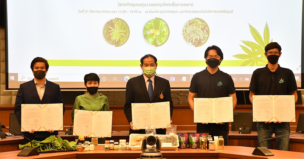 เมื่อเวลา 11.00 น.วันที่ 31 ส.ค. 2564 มหาวิทยาลัยเทคโนโลยีราชมงคลธัญบุรี โดย ผศ.ดร.สมหมาย ผิวสอาด อธิการบดี ร่วมกับ บริษัท ทีเอชซีจี กรุ๊ป จำกัด โดยนายธนารัตน์ จิตต์พายัพ กรรมการผู้จัดการ พร้อมด้วยนางอรพินทร์ พญาพิทักษ์สกุล ประธานที่ปรึกษาวิสาหกิจชุมชนผู้ปลูกและแปรรูปบุกเขาค้อ จ.เพชรบูรณ์ นายพลวรรธน์ พญาพิทักษ์สกุล รองประธานวิสาหกิจชุมชนกลุ่มปลูกและแปรรูปบุก,เกษตรอินทรีย์บ้านทุ่งแพม จ.แม่ฮ่องสอน และนายณัฐวรรธน์ วรพนิตกุล รองประธานวิสาหกิจชุมชนทุ่งนางแลสมุนไพรเพื่อการแพทย์ จ.เพชรบูรณ์ ได้ร่วมพิธีลงนามบันทึกข้อตกลงความร่วมมือว่าด้วยการศึกษา วิจัย และพัฒนาโครงการวิจัย กัญชา กัญชง กระท่อม และพืชสมุนไพร เพื่อใช้ประโยชน์ทางการแพทย์ เชิงพาณิชย์และอุตสาหกรรม โดยมี ศ.ดร.พิชัย สนแจ้ง และ ผศ.ดร.ภูธดา คุนผลิน ที่ปรึกษา บริษัท ทีเอชซีจี กรุ๊ป จำกัด ร่วมเป็นสักขีพยาน