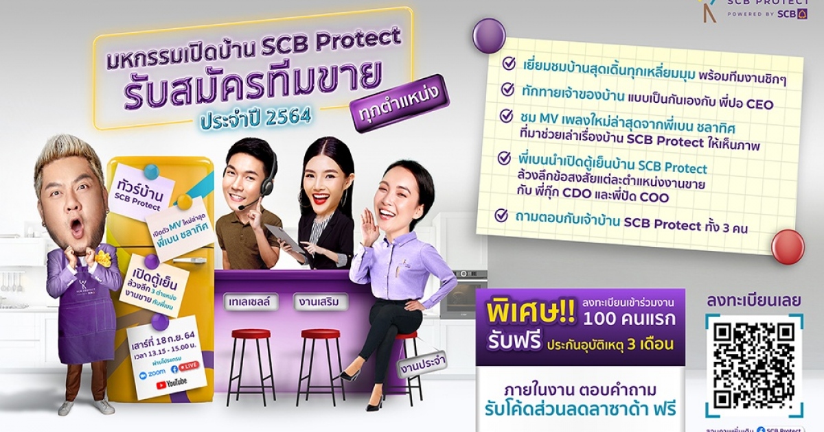 บริษัท ไทยพาณิชย์ โพรเทค จำกัด (SCB Protect) อาสาสร้างรายได้ในยุคโควิด เพิ่มโอกาสให้คนมีไฟสามารถเติบโตในธุรกิจนายหน้าประกันชีวิตและประกันวินาศภัยอย่างมั่นใจใน “มหกรรมเปิดบ้าน SCB Protect รับสมัครทีมขายประจำปี 2564” ในรูปแบบออนไลน์ ร่วมสนุกและเข้าใจธุรกิจประกันยุคใหม่ในแบบที่ไม่เหมือนใคร พร้อมเปิดตัวพรีเซ็นเตอร์คนแรก พี่เบน ชลาทิศ ตันติวุฒิ ที่มากับ MV เพลงใหม่ล่าสุด รับชมครั้งแรกก่อนใคร ภายในงาน นอกจากนี้ผู้สนใจงานยังจะได้เยี่ยมชมบ้าน ระบบการทำงาน และทีมงานสนับสนุนเบื้องหลัง พร้อมแนะนำหลากหลายตำแหน่งงานขาย และผลตอบแทน โดยผู้บริหารของ SCB Protect แบบสดๆ มาชมครั้งเดียวได้ทั้งงาน ทั้งความสุข ตลอด 1 ชั่วโมงเต็ม ใน วันเสาร์ที่ 18 กันยายน 2564 เวลา 13:15-14:30น.( เริ่มงาน 13:30น. ตรง)