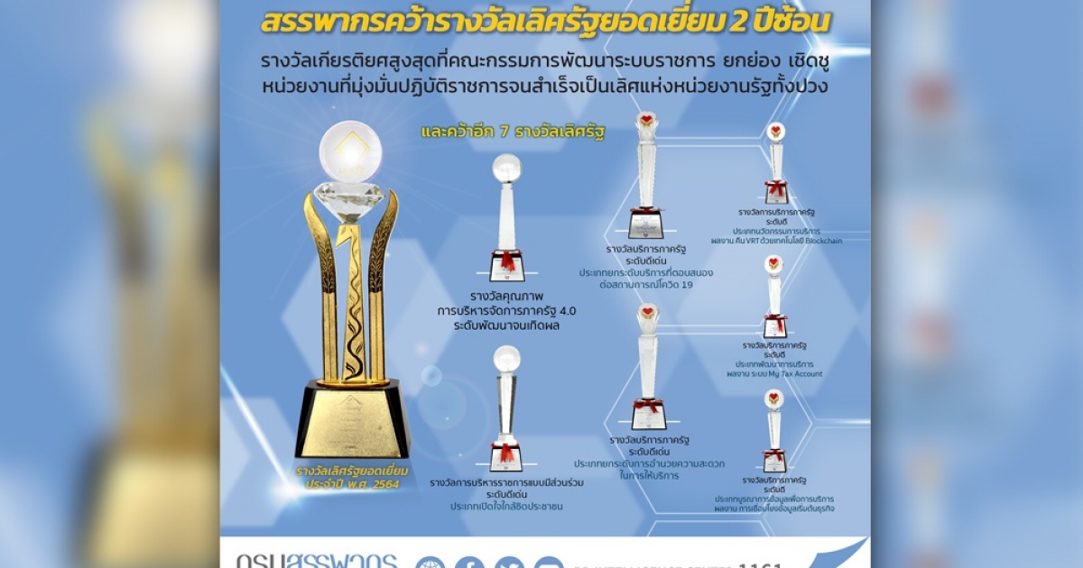 สรรพากรคว้ารางวัลเลิศรัฐยอดเยี่ยม 2 ปีติด พร้อมกวาดอีก 7 รางวัลเลิศรัฐมาครอง ยกระดับการบริการดิจิทัล เต็มรูปแบบ พร้อมออกนโยบายภาษีรองรับสถานการณ์โควิดอย่างครบวงจร