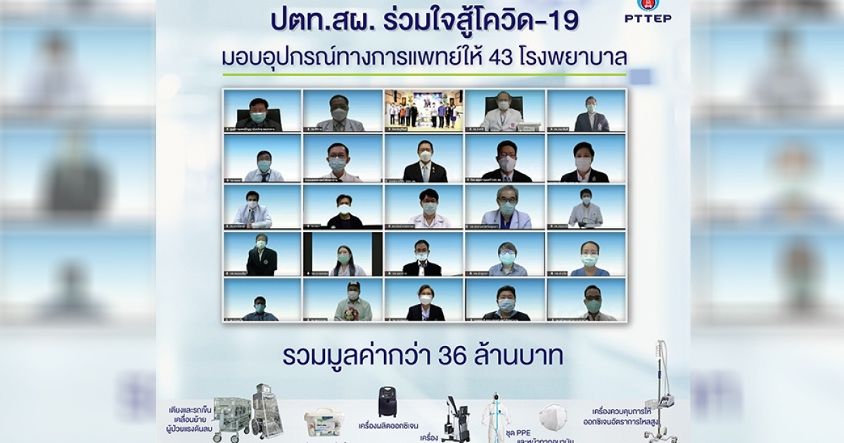 นายพงศธร ทวีสิน ประธานเจ้าหน้าที่บริหาร บริษัท ปตท.สำรวจและผลิตปิโตรเลียม จำกัด (มหาชน) หรือ ปตท.สผ. มอบอุปกรณ์ทางการแพทย์ ให้กับโรงพยาบาลและสำนักงานสาธารณสุข เพิ่มอีก 43 แห่ง ทั่วประเทศ อาทิ รถเข็นและเตียงเคลื่อนย้ายผู้ป่วยแรงดันลบ เครื่องให้อากาศผสมออกซิเจนอัตราการไหลสูง (Oxygen High Flow) เครื่อง Mobile X-Ray เครื่องผลิตออกซิเจน ฯลฯ และ กล่องความห่วงใยสำหรับผู้ป่วยโควิด-19 ที่ต้องดูแลตนเองที่บ้าน รวมมูลค่ากว่า 36,000,000 บาท ซึ่งอุปกรณ์ดังกล่าวจะกระจายไปตามความประสงค์ของแต่โรงพยาบาล เพื่อช่วยในการดูแลและรักษาผู้ป่วยโควิด-19 โดยมี นายดำรงชัย เนรมิตตกพงศ์ รองผู้ว่าราชการจังหวัดบุรีรัมย์ ผู้อำนวยการโรงพยาบาลต่าง ๆ และผู้แทนเข้าร่วมในพิธี ซึ่งจัดขึ้นในรูปแบบออนไลน์