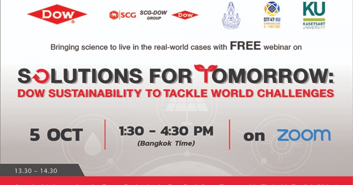 กลุ่มบริษัท ดาว ประเทศไทย (Dow) ผู้นำด้านแมททีเรียลส์ ไซแอนซ์ (Materials Science) ที่มุ่งมั่นดำเนินโครงการด้านความยั่งยืน ร่วมกับสมาคมวิทยาศาสตร์แห่งประเทศไทยฯ จัดสัมมนาออนไลน์ฟรี (Symposium) ในงานประชุมวิชาการนานาชาติ STT47 หัวข้อ “Solutions for Tomorrow: Dow Sustainability to Tackle World Challenges” ให้กับนักวิชาการ นักวิจัย นักศึกษา ภาครัฐ ภาคเอกชน และประชาชนที่สนใจ ในวันอังคารที่ 5 ตุลาคม 2564 เวลา 13.30 – 16.30 น. ผ่าน Zoom Application โดยนักวิทยาศาสตร์และผู้เชี่ยวชาญของ Dow ทั้งในไทยและต่างประเทศจะมาร่วมแบ่งปันประสบการณ์และกรณีศึกษาจากการนำความรู้เชิงวิชาการและนวัตกรรมมาประยุกต์เพื่อสร้างอนาคตที่ยั่งยืนอย่างเป็นรูปธรรมในประเด็นต่าง ๆ ที่น่าสนใจ อาทิ นวัตกรรมเพื่อความยั่งยืนสำหรับบรรจุภัณฑ์แห่งอนาคต กรณีศึกษาสนามกีฬาแนวใหม่จากวัสดุเหลือใช้สร้างได้อย่างไร และกระบวนการผลิตสารเคมีอย่างยั่งยืนเพื่ออนาคต โดยผู้ที่สนใจลงทะเบียนภายใน 30 กันยายนนี้ หรือโทรสอบถามรายละเอียดเพิ่มเติมได้ที่คุณพรธิชา วงศ์ยานนาวา โทร. 081-9066082 อีเมล [email protected]