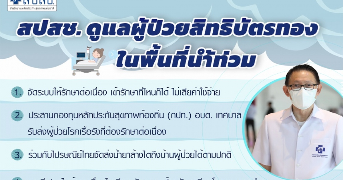 สปสช. อภ. ปณท.ดบ. และสมาคมเพื่อนโรคไต ร่วมเฝ้าระวัง “ผู้ป่วยล้างไตช่องท้อง” ในพื้นที่ประสบภัยน้ำท่วม พบน้ำยาล้างไตในบ้านผู้ป่วย 3 ราย ถูกน้ำท่วม น้ำพัดเสียหาย เร่งจัดส่งทดแทนแล้ว พร้อมประกาศให้ผู้ป่วยทั่วไป ผู้ป่วยโรคเรื้อรัง และผู้ป่วยฉุกเฉิน ในพื้นที่อุทกภัย เข้ารับบริการที่หน่วยบริการใดก็ได้ ถือเป็นกรณีฉุกเฉิน