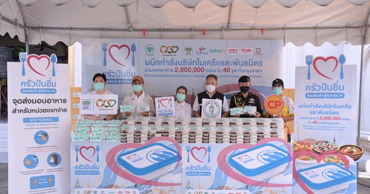 โครงการ "ครัวปันอิ่ม ซีพีร้อยเรียงใจ สู้ภัยโควิด-19" เป็นการผนึกกำลังของเครือเจริญโภคภัณฑ์ ซีพีเอฟ ร่วมกับพันธมิตร มากกว่า 400 องค์กร ส่งมอบข้าวกล่องอุ่นร้อนพร้อมรับประทาน จำนวน 2 ล้านกล่อง ประกอบด้วย 1 ล้านกล่องแรก ซื้อจากร้านอาหารรายย่อย และอีก 1 ล้านกล่องมาจากซีพีเอฟ เป็นอาหารที่ปรุงใหม่ สุก สะอาด ถูกสุขอนามัย มีเมนูอาหารที่หลากหลาย โดยเครือข่ายจิตอาสา มูลนิธิ และหน่วยงานพันธมิตร จะรับอาหารจาก 40 จุด กระจายสู่ชุมชนต่างๆ ทั่วกรุงเทพฯ และปริมณฑล เพื่อช่วยบรรเทาความเดือดร้อนแก่ผู้ที่ขาดรายได้ ว่างงาน กลุ่มเปราะบาง กลุ่มที่กักตัวดูอาการ และผู้ที่รักษาตัวที่บ้านหรือ Home Isolation ตลอดจนช่วยอุดหนุนธุรกิจร้านอาหารรายย่อยให้มีรายได้ในสถานการณ์เช่นนี้