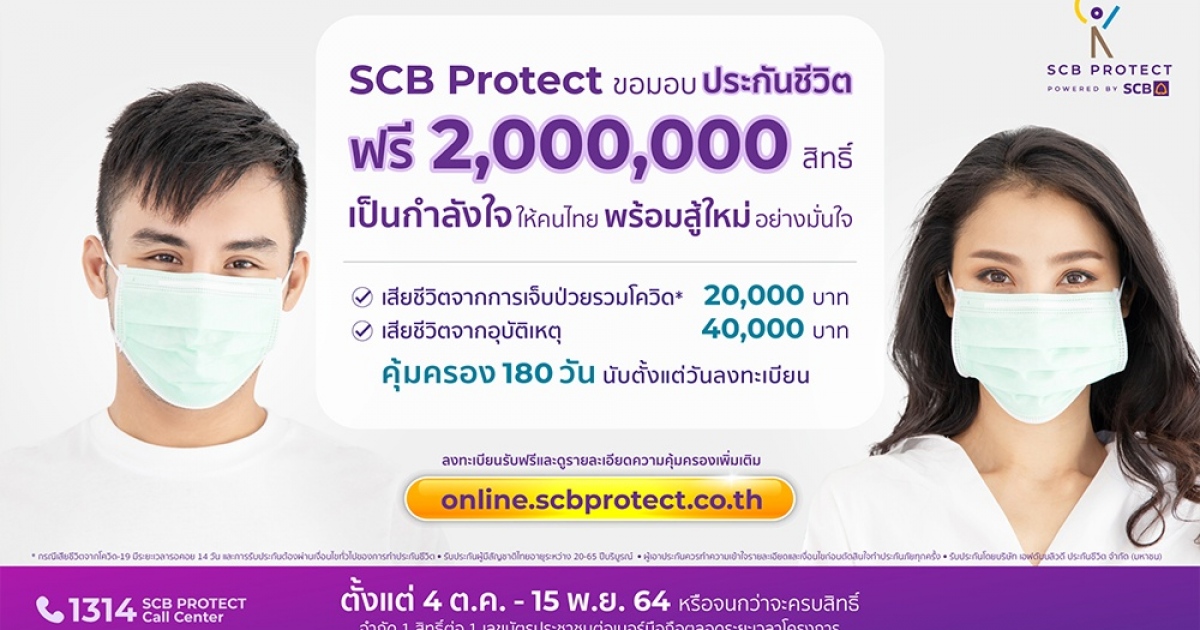 ไทยพาณิชย์ โพรเทค เดินหน้าส่งมอบความคุ้มครองให้คนไทยทั่วประเทศผ่านพ้นวิกฤตโควิด-19 ด้วยการมอบ ฟรีประกันชีวิตจำนวน 2 ล้านสิทธิ์ ที่ให้ความคุ้มครองนานถึง 180 วันนับแต่วันที่ลงทะเบียน ลงทะเบียนรับฟรี ผ่าน online.scbprotect.co.th ได้ตั้งแต่วันนี้ – 15 พฤศจิกายน 2564 หรือจนกว่าจะครบ 2 ล้านสิทธิ์