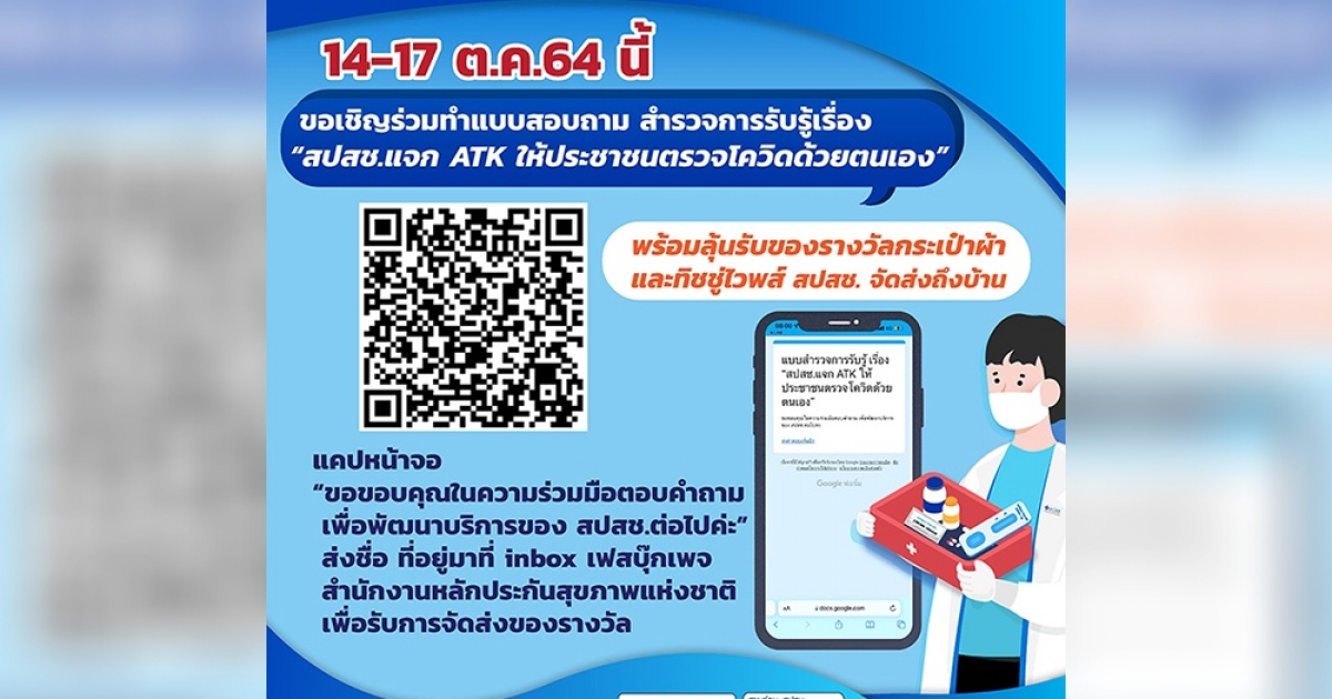 สปสช.ขอความร่วมมือประชาชนตอบแบบสอบถามการรับรู้เรื่องการแจก ATK ให้ตรวจโควิดด้วยตนเอง หวังนำข้อมูลไปปรับกลยุทธ์การกระจายชุดตรวจให้ครอบคลุมและเข้าถึงกลุ่มเป้าหมายมากขึ้น