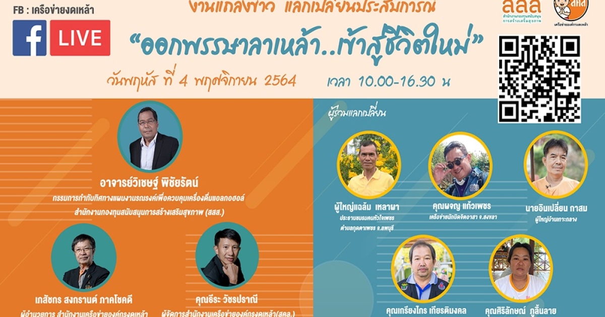 เมื่อวันที่ 4 พ.ย. 2564 สำนักงานกองทุนสนับสนุนการสร้างเสริมสุขภาพ (สสส.) ร่วมกับเครือข่ายองค์กรงดเหล้า จัดเสวนาออนไลน์ที่แฟนเพจเฟซบุ๊กเครือข่ายงดเหล้า แลกเปลี่ยนประสบการณ์ จัดเสวนา “ออกพรรษาลาเหล้า..เข้าสู่ชีวิตใหม่” ชวนทุกคนใช้ชีวิตหลังเปิดประเทศอย่างระมัดระวัง ป้องวงจรโควิด-19 ระบาดซ้ำ เพื่อสุขภาวะที่ดี