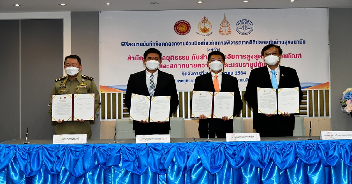 ในการกลับมาดำเนินกระบวนพิจารณาคดีที่อาจเรียกได้ว่าเป็นกระบวนพิจารณาคดีในวิถีใหม่นี้ หากปราศจากความร่วมมือของหน่วยงานและองค์กรทุกภาคส่วนในกระบวนการยุติธรรมแล้วการดำเนินคดีย่อมไม่สามารถดำเนินการต่อไปได้ ดังนั้น สำนักงานศาลยุติธรรมจึงได้จัดทำบันทึกข้อตกลงความร่วมมือเกี่ยวกับการพิจารณาคดีที่ปลอดภัยด้านสุขอนามัยกับ 3 หน่วยงานในกระบวนการยุติธรรม เพื่อสนับสนุนมาตรการความปลอดภัยด้านสุขอนามัยแก่ผู้ต้องขัง และบุคลากรในการดำเนินคดีที่ศาล ด้วยการส่งเสริมให้มีการนำวิธีการพิจารณาคดีทางอิเล็กทรอนิกส์มาใช้ รวมทั้งวางระบบการบริหารจัดการคดีให้เหมาะสมภายในมาตรฐานระยะเวลาที่กำหนด ภายใต้ข้อจำกัดของสถานการณ์การแพร่ระบาดของโรคติดเชื้อไวรัสโคโรนา 2019 โดยตกลงร่วมมือกันด้วยการจัดให้มีการพิจารณาคดีในทุกขั้นตอนอย่างปลอดภัยด้านสุขอนามัย ด้วยการคัดกรองผู้มาติดต่อราชการศาลด้วยระบบอิเล็กทรอนิกส์ จำกัดบุคคลที่อยู่ในห้องพิจารณา จำกัดการเยี่ยมอย่างใกล้ชิดกับผู้ต้องหาหรือจำเลย และบุคคลอื่น และมีข้อตกลงความร่วมมือด้านอื่น ๆ ดังนี้