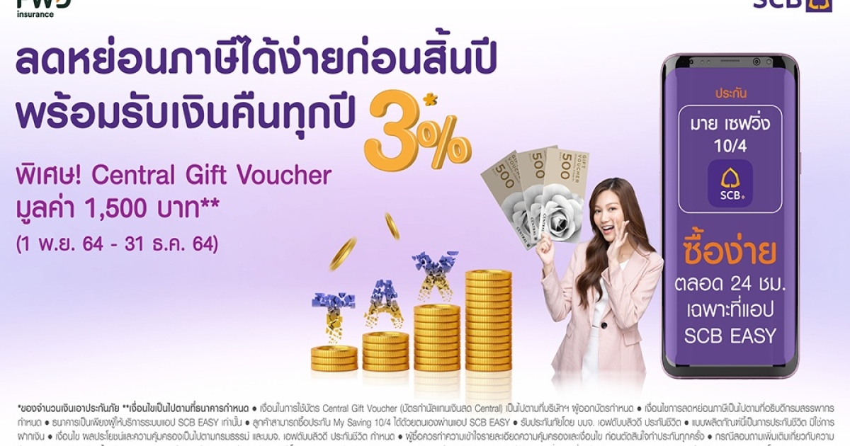 พิเศษสุด สำหรับลูกค้าที่ซื้อและชำระเงินค่าเบี้ยประกัน มาย เซฟวิ่ง 10/4 ผ่านแอป SCB EASY ตั้งแต่ 1 พฤศจิกายน 2564 - 31 ธันวาคม 2564 จะได้รับบัตรกำนัลแทนเงินสด Central มูลค่า 1,500 บาทต่อท่าน*