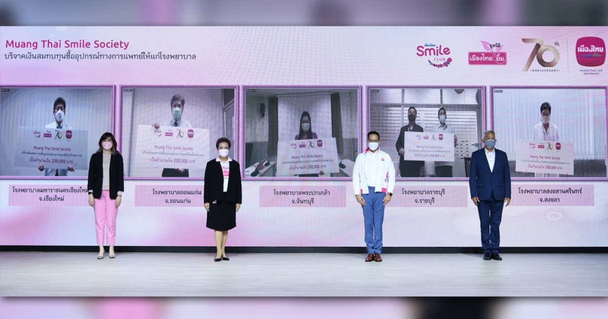 บริษัท เมืองไทยประกันชีวิต จำกัด (มหาชน) โดยนายสาระ ล่ำซำ ประธานเจ้าหน้าที่บริหาร (กลาง) ร่วมกับมูลนิธิเมืองไทยยิ้ม โดยนางพิตราภรณ์ บุณยรัตพันธุ์ รองประธานกรรมการมูลนิธิเมืองไทยยิ้ม (ที่ 3 จากซ้าย) ร่วมบริจาคเงินสมทบทุนซื้ออุปกรณ์ทางการแพทย์ จำนวน 1,000,000 บาท ให้แก่ 5 โรงพยาบาลในพื้นที่ 5 ภูมิภาคทั่วประเทศ โรงพยาบาลละ 200,000 บาท ดังนี้ โรงพยาบาลมหาราชนครเชียงใหม่ จ.เชียงใหม่ โรงพยาบาลขอนแก่น จ.ขอนแก่น โรงพยาบาลพระปกเกล้า จ.จันทบุรี โรงพยาบาลราชบุรี จ.ราชบุรี และโรงพยาบาลสงขลานครินทร์ จ.สงขลา เพื่อใช้ในสถานการณ์การแพร่ระบาดของโรคติดเชื้อไวรัสโคโรนา 2019 (COVID-19) โดยเงินบริจาคในครั้งนี้ เป็นการบริจาคคะแนนสะสม Smile Point ของลูกค้าเมืองไทยประกันชีวิต สมาชิกเมืองไทยสไมล์คลับที่ร่วมบริจาค ผ่านช่องทางแอปพลิเคชัน MTL Click ที่สะดวกเเละปลอดภัย เพื่อสนับสนุนการดำเนินงานของบุคลากรทางการแพทย์ในโรงพยาบาลที่ร่วมโครงการ Muang Thai Smile Society ซึ่งเป็นการจัดงานผ่านระบบ Virtual ณ เมืองไทยประกันชีวิต สำนักงานใหญ่