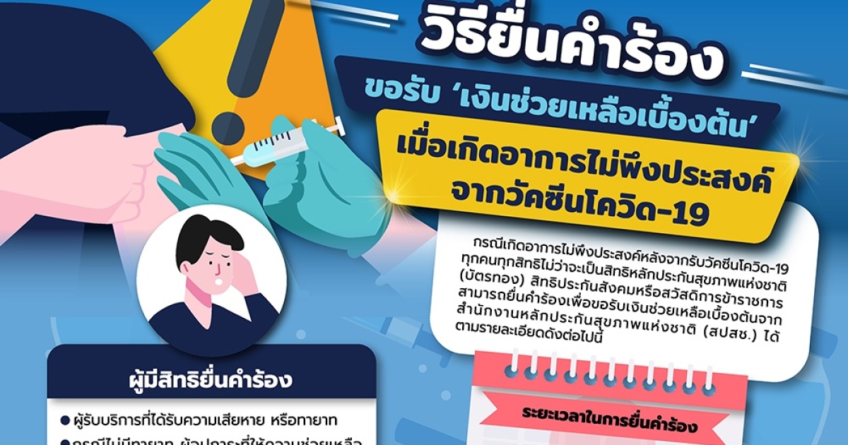 ดาวน์โหลดแแบบคำร้องขอรับเงินช่วยเหลือเบื้องต้นกรณีได้รับความเสียหายจากการรับวัคซีนป้องกันโควิดได้ที่ https://www.nhso.go.th/storage/files/841/001/nhso_VaccinCovid19.pdf