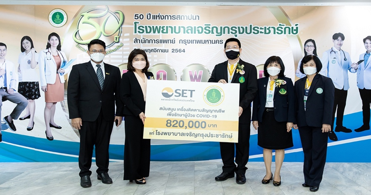 ลดาวัลย์ กันทวงศ์ ผู้อำนวยการอาวุโส ฝ่ายบริหารกิจกรรมเพื่อสังคม ตลาดหลักทรัพย์แห่งประเทศไทย มอบเงินสนับสนุน 820,000 บาทแก่โรงพยาบาลเจริญกรุงประชารักษ์ เพื่อสนับสนุนเครื่องติดตามสัญญาณชีพเพื่อรักษาผู้ป่วย COVID-19 โดยมี นพ. เกรียงไกร ตั้งจิตรมณีศักดา ผู้อำนวยการ โรงพยาบาลเจริญกรุงประชารักษ์ เป็นผู้รับมอบ ทั้งนี้ ตลาดหลักทรัพย์ฯ ได้มีการสมทบทุนผ่านองค์กร หน่วยงาน และมูลนิธิต่างๆ ต่อเนื่อง เพื่อส่งต่อความช่วยเหลือไปยังประชาชนและผู้ได้รับผลกระทบ หวังเป็นส่วนหนึ่งในการบรรเทาความเดือดร้อนแก่ประชาชนจากสถานการณ์ของโควิด-19