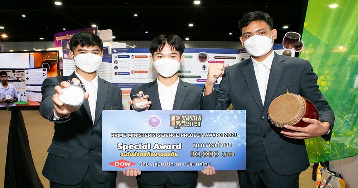 ด้วยแนวคิดในการแก้ไขสิ่งแวดล้อมอย่างยั่งยืนและสร้างสรรค์ ทำให้โครงงานเยาวชนระดับมัธยมศึกษาตอนต้น จากโรงเรียนวิทยาศาสตร์จุฬาภรณราชวิทยาลัย ปทุมธานี ได้รับรางวัล Special Award ซึ่งสนับสนุนโดยกลุ่มบริษัท ดาว ประเทศไทย (Dow) พร้อมทุนการศึกษา 30,000 บาท จากโครงการ “Prime Minister’s Science Award 2021 โดยรางวัลดังกล่าวมีวัตถุประสงค์เพื่อยกย่องเชิดชูเกียรติและเสริมสร้างขวัญกำลังใจให้กับเยาวชนที่ได้ทำคุณประโยชน์และเป็นตัวอย่างอันดีด้านวิทยาศาสตร์ รวมทั้งยกย่องเชิดชูเกียรติครูวิทยาศาสตร์ที่อุทิศตนอย่างต่อเนื่องในการส่งเสริมการพัฒนาเยาวชนให้มีความสนใจด้านวิทยาศาสตร์และพัฒนาศักยภาพเพื่อความพร้อมต่อเวทีนานาชาติ รวมทั้งเพื่อช่วยกระตุ้นให้เยาวชนเกิดแรงบันดาลใจ และสนับสนุนส่งเสริมให้ครูมีกำลังใจมากขึ้น ร่วมผลักดันการพัฒนาทักษะการเรียนรู้ในศตวรรษที่ 21