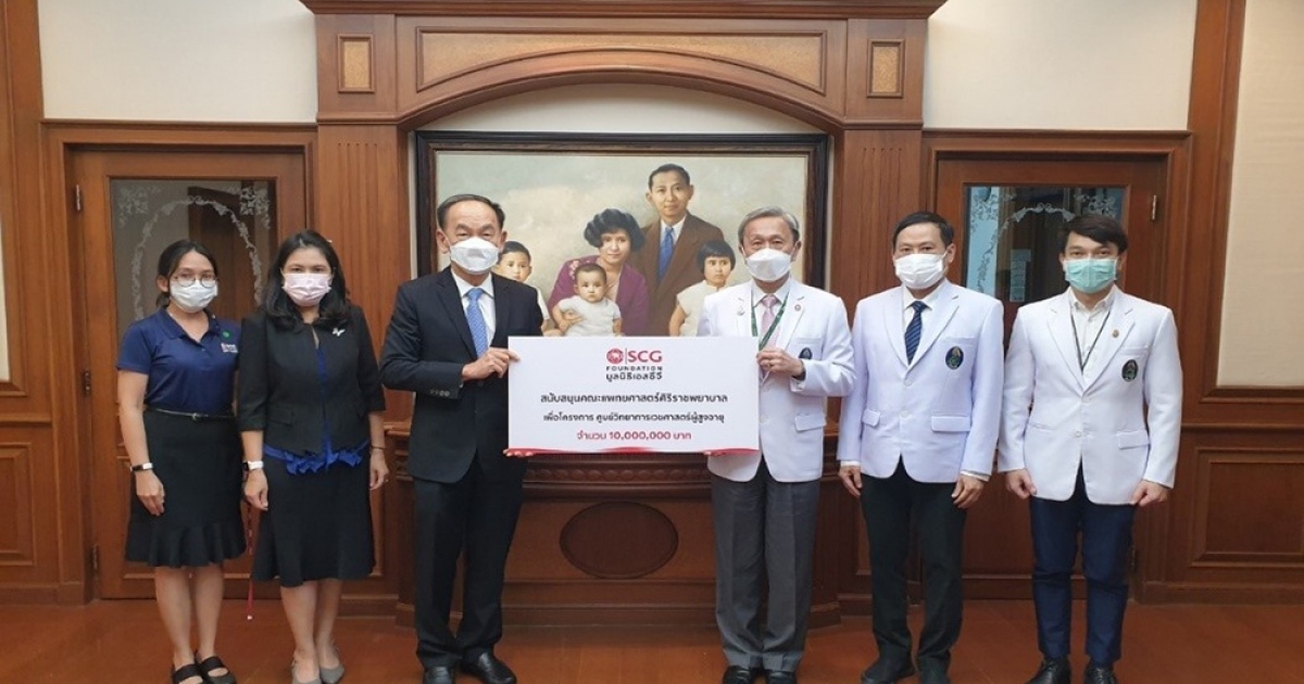 มูลนิธิเอสซีจี นำโดยคุณเชาวลิต เอกบุตร (ที่ 3 จากซ้าย) กรรมการบริหารมูลนิธิเอสซีจี และคุณสุวิมล จิวาลักษณ์ กรรมการและผู้จัดการมูลนิธิเอสซีจี (ที่ 2 จากซ้าย) ร่วมสนับสนุนงบประมาณจำนวน 10 ล้านบาท แก่ คณะแพทยศาสตร์ศิริราชพยาบาล ในโครงการ “ศูนย์วิทยาการเวชศาสตร์ผู้สูงอายุระดับชาติ” เพื่อสร้างพื้นที่จำลอง Dementia friendly Environment ให้กับผู้ป่วยที่มีภาวะสมองเสื่อมเพื่อช่วยกระตุ้นความทรงจำ และพัฒนาการด้านต่างๆ โดยมี ศ.ดร.นพ.ประสิทธิ์ วัฒนาภา (ที่ 3 จากขวา) คณบดีคณะแพทยศาสตร์ศิริราชพยาบาล พร้อมด้วย ศ.นพ.ประเสริฐ อัสสันตชัย (ที่ 2 จากขวา) รองคณบดีคณะแพทยศาสตร์ศิริราชพยาบาล และประธานโครงการศูนย์วิทยาการเวชศาสตร์ผู้สูงอายุระดับชาติ และ รศ.นพ.นริศ กิจณรงค์ (ที่ 1 จากขวา) รองคณบดีฝ่ายสื่อสารองค์กร และกิจกรรมเพื่อสังคม เป็นผู้รับมอบ