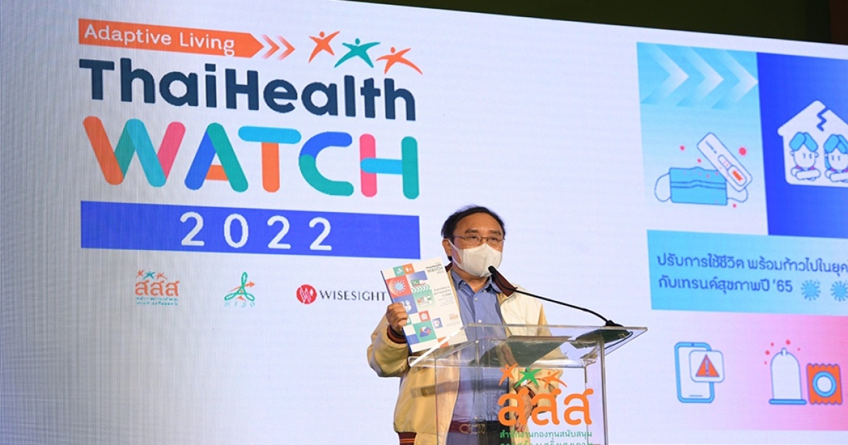 เมื่อวันที่ 20 ธันวาคม 2564 ที่อาคารศูนย์เรียนรู้สุขภาวะ สำนักงานกองทุนสนับสนุนการสร้างเสริมสุขภาพ (สสส.) ร่วมกับ สำนักงานพัฒนาระบบข้อมูลข่าวสารสุขภาพ บริษัท ไวซ์ไซท์ ประเทศไทย จำกัด และภาคีเครือข่ายภาควิชาการ แถลงข่าว “Thaihealth Watch 2022” จับตาทิศทางสุขภาพคนไทย ปี 2565 ภายใต้แนวคิด Adaptive Living : ปรับการใช้ชีวิต พร้อมก้าวไปในยุคโควิด-19 กับเทรนด์สุขภาพ ปี 65 โดย ดร.สุปรีดา อดุลยานนท์ ผู้จัดการกองทุนสนับสนุนการสร้างเสริมสุขภาพ (สสส.) กล่าวว่า สสส. ร่วมกับภาคีเครือข่าย มุ่งสร้างความตระหนักรู้เพื่อให้คนไทยปรับเปลี่ยนพฤติกรรมหันมาดูแลสุขภาพ โดยจัดทำ 10 ประเด็นทิศทางสุขภาพคนไทย ปี 2565 ให้ครอบคลุม สุขภาวะทั้ง 4 มิติ ทั้งกาย จิต ปัญญา และสังคม พัฒนาองค์ความรู้โดยใช้หลักการ 3S ได้แก่ 1.Situation สถานการณ์สุขภาพคนไทย ปี 2563–2564 สถิติ ทิศทาง หรือแนวโน้มของปัญหาที่เกิดขึ้น 2.Social Trend กระแสความสนใจในสื่อสังคมออนไลน์ ที่สะท้อนแนวโน้มพฤติกรรมสุขภาพของคนไทย และ 3.Solution ข้อแนะนำ ทั้งในระดับปัจเจกบุคคล อาทิ แพลตฟอร์มออนไลน์เพื่อตรวจสอบข่าว โคแฟค มาตรการชุมชนเพื่อชุมชน Home-Community Isolation หลักสูตรเลี้ยงลูกออนไลน์ NET PA-MA และข้อเสนอแนะเชิงนโยบายต่อสังคม อาทิ จัดตั้งสภาลมหายใจภาคเหนือ ผลักดันร่างกฎหมายอากาศเพื่อสุขภาพ ลดปัญหามลพิษทางอากาศ สนับสนุนยุทธศาสตร์ด้านถุงยางอนามัย (พ.ศ. 2563-2573) ลดปัญหาท้องไม่พร้อม และโรคติดต่อทางเพศสัมพันธ์