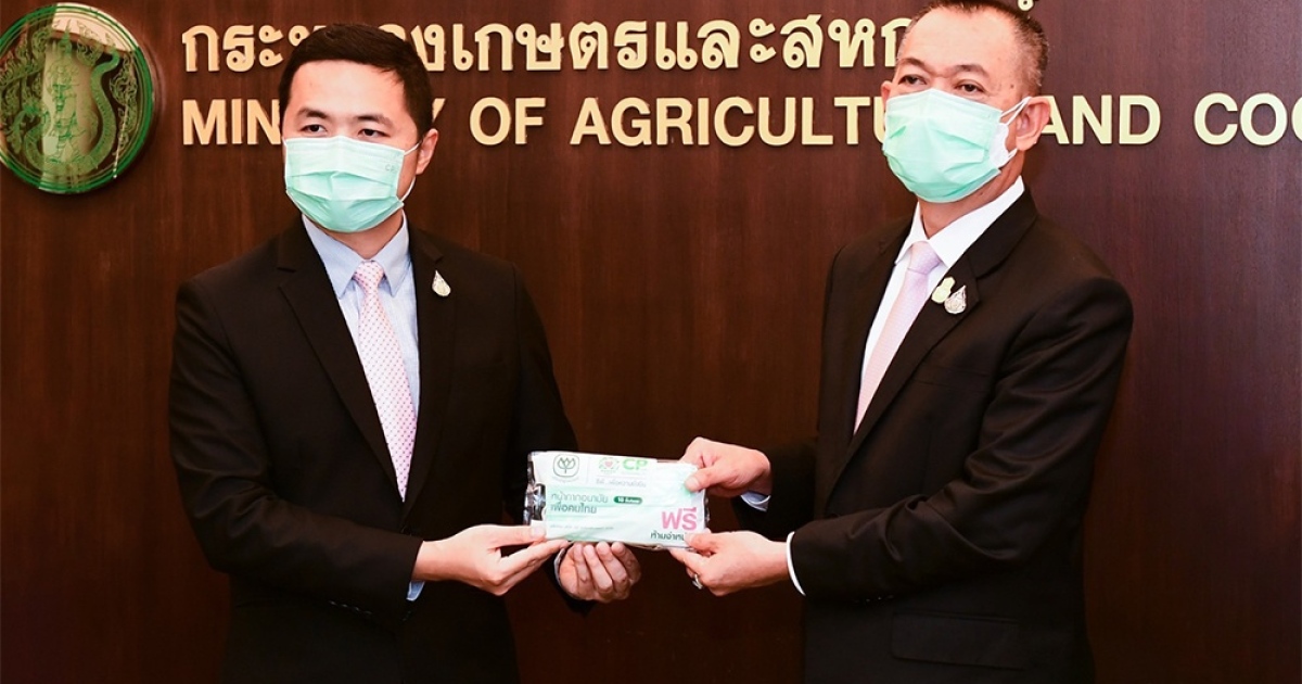 ดร.เฉลิมชัย ศรีอ่อน รัฐมนตรีว่าการกระทรวงเกษตรและสหกรณ์ รับมอบ ‘หน้ากากอนามัย CP’ จำนวน 100,000 ชิ้น จากมูลนิธิเจริญโภคภัณฑ์ โดย นายจอมกิตติ ศิริกุล รองกรรมการผู้จัดการอาวุโส ด้านพัฒนาความยั่งยืนภาครัฐและกิจการสัมพันธ์ เครือเจริญโภคภัณฑ์ และผู้ช่วยบริหาร สำนักประธานคณะกรรมการบริหาร บริษัท เจริญโภคภัณฑ์อาหาร จำกัด (มหาชน) หรือซีพีเอฟ เพื่อส่งต่อความห่วงใยให้แก่พี่น้องประชาชน ได้เข้าถึงอุปกรณ์ในการป้องกันโรคเพื่อสุขภาวะที่ดี ณ อาคารกระทรวงเกษตรฯ