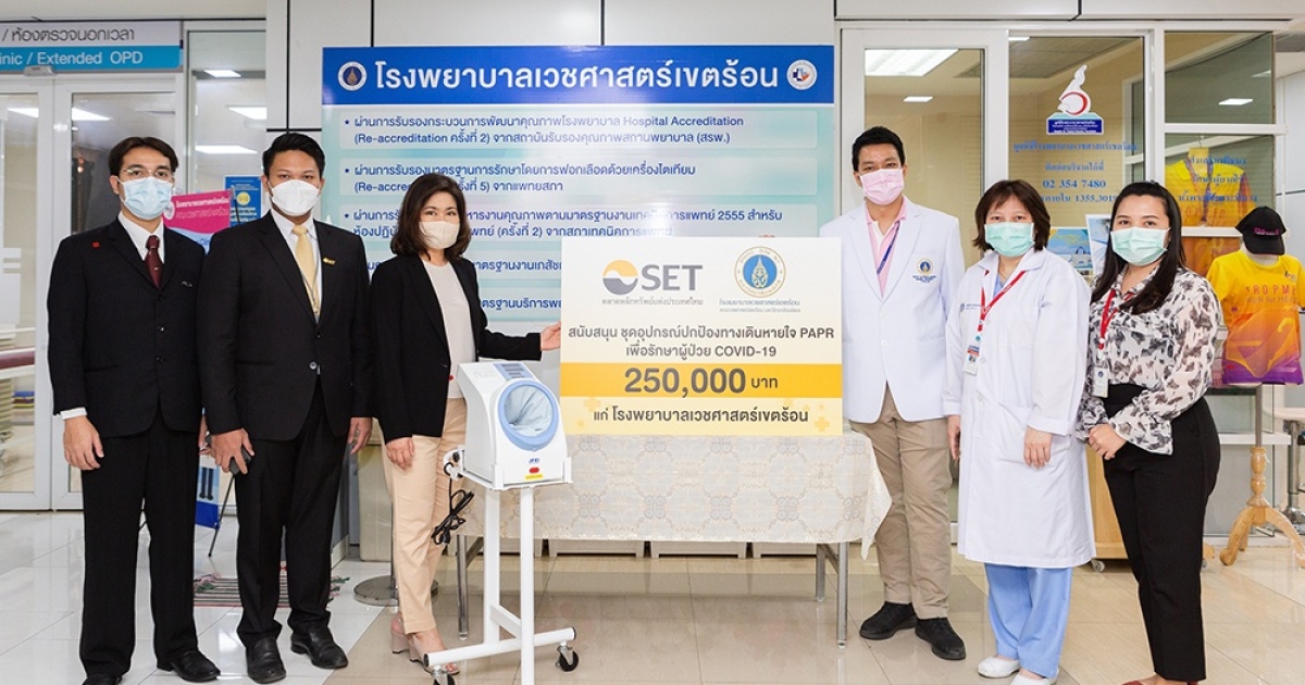 ลดาวัลย์ กันทวงศ์ ผู้อำนวยการอาวุโส ฝ่ายบริหารกิจกรรมเพื่อสังคม ตลาดหลักทรัพย์แห่งประเทศไทย มอบเงินแก่โรงพยาบาลเวชศาสตร์เขตร้อน 250,000 บาท เพื่อสนับสนุนชุดอุปกรณ์ปกป้องทางเดินหายใจ PAPR รักษาผู้ป่วย COVID-19 โดยมี อ.ดร. นพ. สัณฑ์ ม่วงน้อยเจริญ รองผู้อำนวยการ และ รัตนาภรณ์ แซ่ลิ้ม หัวหน้างานผู้ป่วยวิกฤต โรงพยาบาลเวชศาสตร์เขตร้อน เป็นผู้รับมอบ ทั้งนี้ ตลาดหลักทรัพย์ฯ ได้มีการสมทบทุนผ่านองค์กร หน่วยงาน และมูลนิธิต่างๆ ต่อเนื่อง เพื่อส่งต่อความช่วยเหลือไปยังประชาชนและผู้ได้รับผลกระทบ หวังเป็นส่วนหนึ่งในการบรรเทาความเดือดร้อนแก่ประชาชนจากสถานการณ์ของโควิด-19