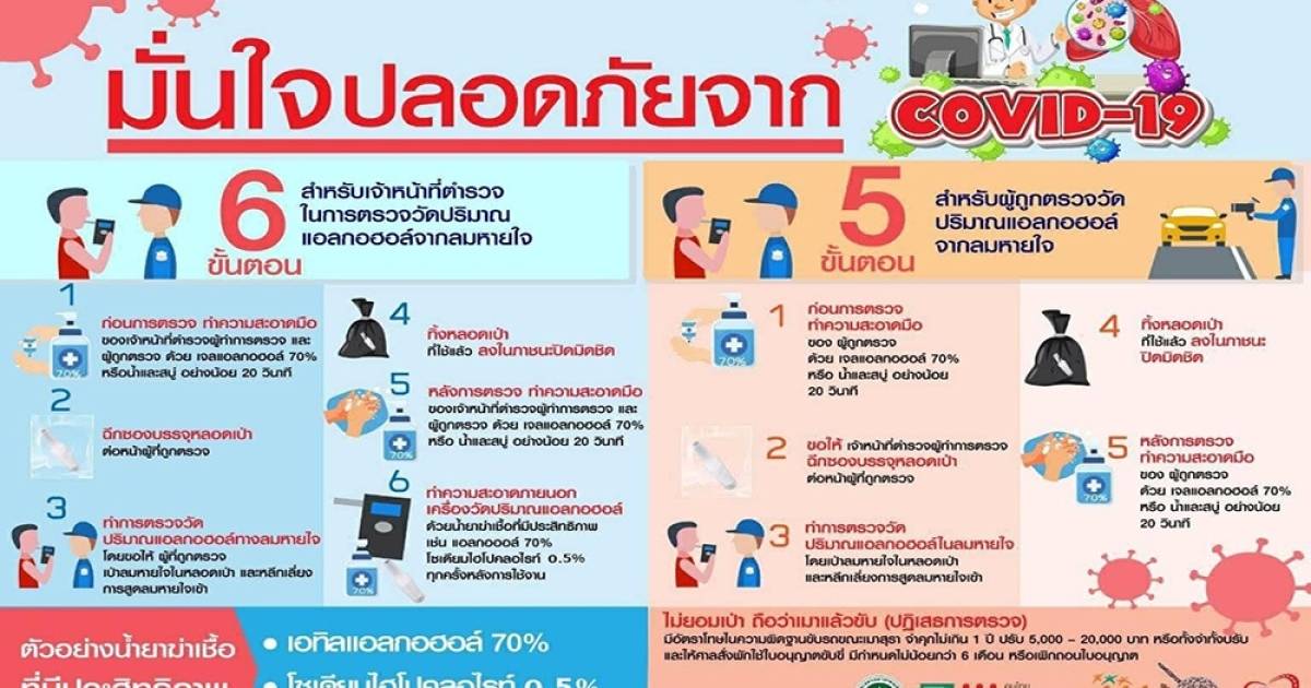 “ สสส. และคณะกรรมการควบคุมเครื่องดื่มแอลกอฮอล์ขอให้ทุกคนมั่นใจในความปลอดภัยของเครื่องตรวจวัดปริมาณแอลกอฮอล์ว่าปลอดภัยจากเชื้อโควิด-19 เพราะเจ้าหน้าที่มีมาตรการป้องกันความเสี่ยง 6 ขั้นตอน ดังนี้ 1.ผู้ตรวจและผู้ถูกตรวจต้องล้างมืออย่างน้อย 20 วินาที 2.ใช้หลอดเป่าแอลกอฮอล์สำหรับวัดปริมาณแอลกอฮอล์อันใหม่ทุกครั้งโดยจะฉีกซองต่อหน้าผู้ถูกตรวจ 3.ตรวจวัดปริมาณแอลกอฮอล์ทางลมหายใจโดยย้ำให้ผู้ถูกตรวจเป่าลมหายใจเข้าไปในหลอด และหลีกเลี่ยงการสูดลมหายใจเข้า 4.ผู้ตรวจจะทิ้งหลอดเป่าที่ใช้แล้วทันทีในภาชนะที่ปิดมิดชิด 5.หลังตรวจผู้ตรวจและผู้ถูกตรวจจะล้างมืออีกครั้งอย่างน้อย 20 วินาที และ 6.ทำความสะอาดเครื่องวัดปริมาณแอลกอฮอล์ด้วยน้ำยาฆ่าเชื้อที่มีประสิทธิภาพ เช่น แอลกอฮอล์ 70% หรือ โซเดียมไฮโปคลอไรท์ 0.5% ทุกครั้งหลังการใช้งาน” นางสาวรุ่งอรุณ กล่าว