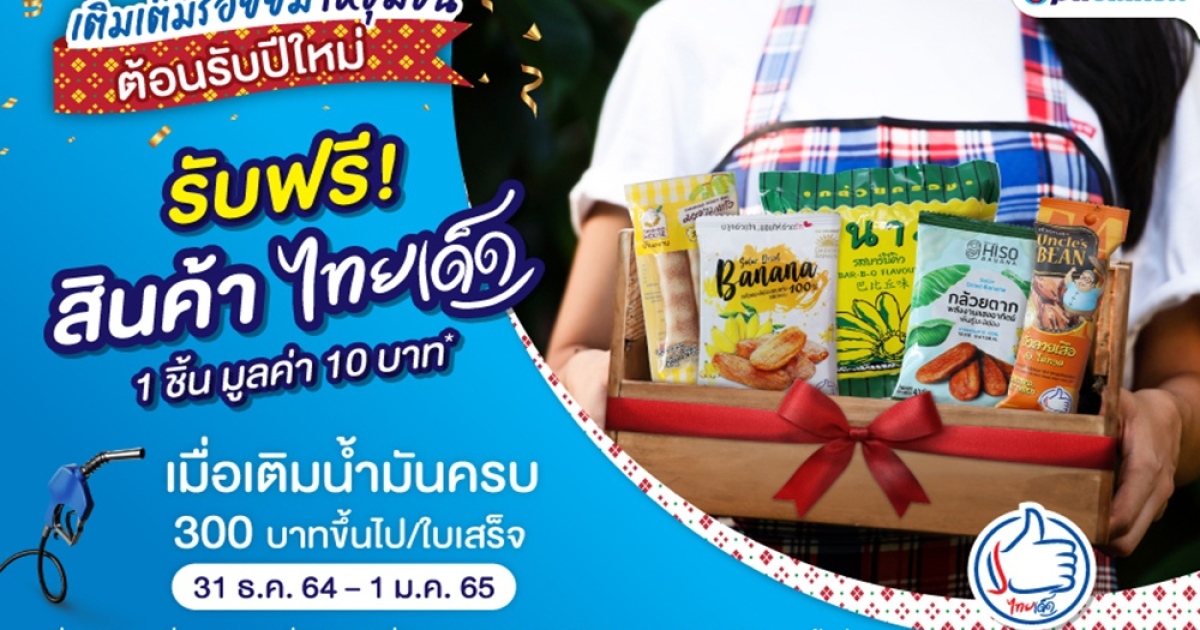 เติมเต็มรอยยิ้มให้ชุมชนต้อนรับปีใหม่ เมื่อเติมน้ำมันครบ 300 บาทขึ้นไป/ใบเสร็จ รับฟรี! สินค้าไทยเด็ด 1 ชิ้น มูลค่า 10 บาท อาทิ มะขามแก้ว ตราบ้านมะขาม, กล้วยตาก ตราแดดดี บานาน่า, ถั่วลายเสือคั่ว ตราคุณลุง, กล้วยตาก ตราไฮโซ และกล้วยกรอบ ตราบานาน่า โดยสินค้าจะมีความแตกต่างกันไปแต่ละพื้นที่