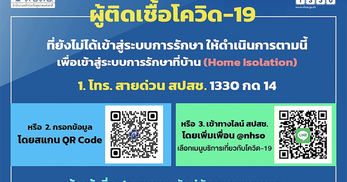 สปสช.เปิด 3 ช่องทางลงทะเบียนสู่ระบบการรักษาที่บ้าน (Home Isolation) ประชาชนทุกคนที่ตรวจ ATK หากพบผลเป็นบวก โทร. สายด่วน สปสช. 1330 กด 14 หรือลงทะเบียนด้วยตนเองทางเว็บไซต์ เพื่อเข้าสู่ระบบการรักษาที่บ้าน โดยจะได้รับการจับคู่สถานพยาบาล เพื่อติดตามและได้รับการดูแลตามมาตรฐาน ป้องกันอาการภาวะรุนแรง พร้อมควบคุมเผ้าระวังโรค