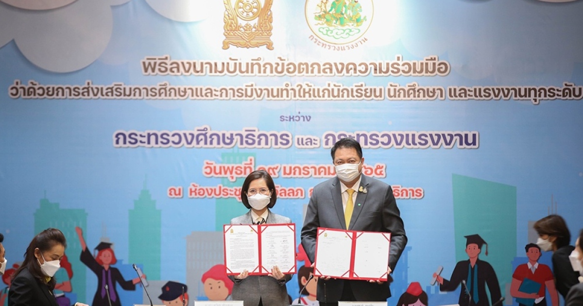 -กระทรวงศึกษาธิการร่วมกับกระทรวงแรงงาน ลงนามความร่วมมือขับเคลื่อนเป้าหมายและกลไกในการบูรณาการภารกิจ พัฒนาทักษะฝีมือให้แก่นักเรียน นักศึกษาก่อนเข้าสู่ตลาดแรงงาน