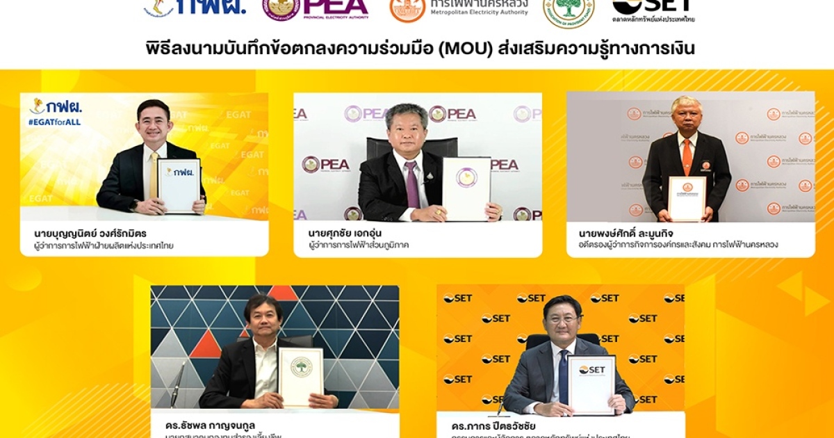 ภากร ปีตธวัชชัย กรรมการและผู้จัดการ ตลาดหลักทรัพย์แห่งประเทศไทย ลงนาม MOU กับการไฟฟ้าฝ่ายผลิตแห่งประเทศไทย (กฟผ.) การไฟฟ้าส่วนภูมิภาค (กฟภ.) การไฟฟ้านครหลวง (กฟน.) และสมาคมกองทุนสำรองเลี้ยงชีพ ส่งเสริมความรู้ด้านการวางแผนการเงินการลงทุนแก่บุคลากรและสมาชิกกองทุนสำรองเลี้ยงชีพของแต่ละองค์กร เพื่อให้สามารถบรรลุเป้าหมายทางการเงินและสร้างวินัยการออมเพื่อการเกษียณ ซึ่งเป็นความร่วมมือภายใต้โครงการ “Happy Money สุขเงิน สร้างได้” องค์กรที่สนใจร่วมส่งเสริมความรู้ด้านการเงินกับตลาดหลักทรัพย์ฯ ดูรายละเอียดเพิ่มเติมที่ www.set.or.th/happymoney