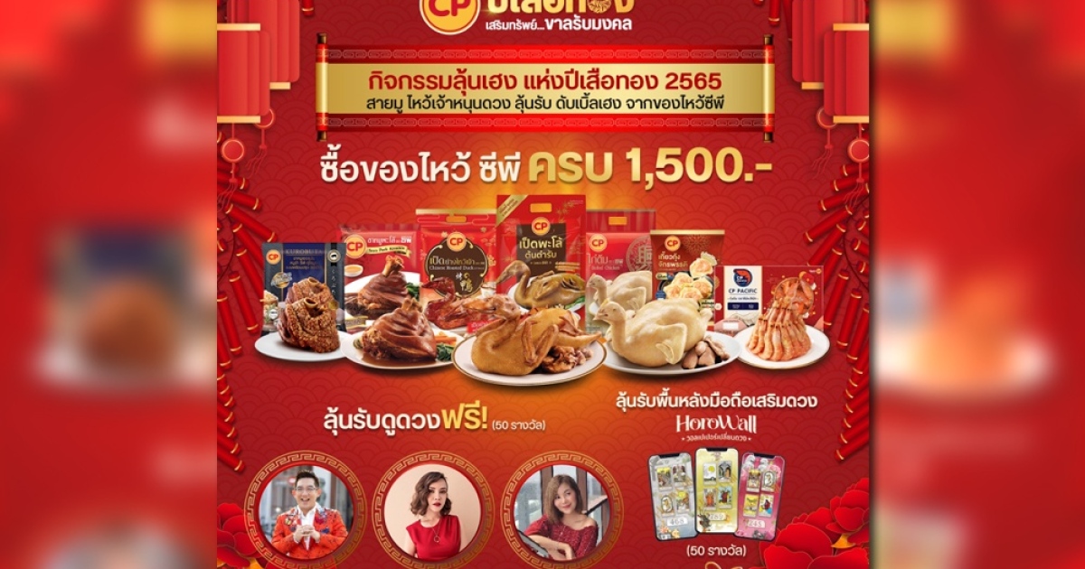สำหรับเทศกาลตรุษจีนในปีนี้ ซีพีเอฟ ได้จัดกิจกรรม “ซื้อชุดไหว้ ซีพี ครบ 1,500 บาท” ลุ้นดูดวงฟรีกับกองทัพหมอดูชั้นนำถึง 50 รางวัล และลุ้นรับพื้นหลังมือถือเสริมเฮงอีก 50 รางวัล ตั้งแต่วันนี้ ถึง 4 ก.พ. 2565 โดยสามารถติดตามกิจกรรมต่างๆ และสั่งซื้อสินค้าช่องทางออนไลน์ได้ที่ chinesenewyear.cpbrandsite.com หรือเลือกซื้อได้ที่ห้างสรรพสินค้าชั้นนำใกล้บ้าน ได้แก่ แม็คโคร, โลตัส, ซีพี เฟรชมาร์ท, บิ๊กซี, กูร์เมต์ มาร์เก็ต, ท็อปส์ ซูเปอร์มาร์เก็ต, แม็กซ์แวลู, โกลเด้น เพลซ และ Dear Tummy ศูนย์การค้าไอคอนสยาม พร้อมทั้งยังลุ้นรับของแถมอีกมากมาย