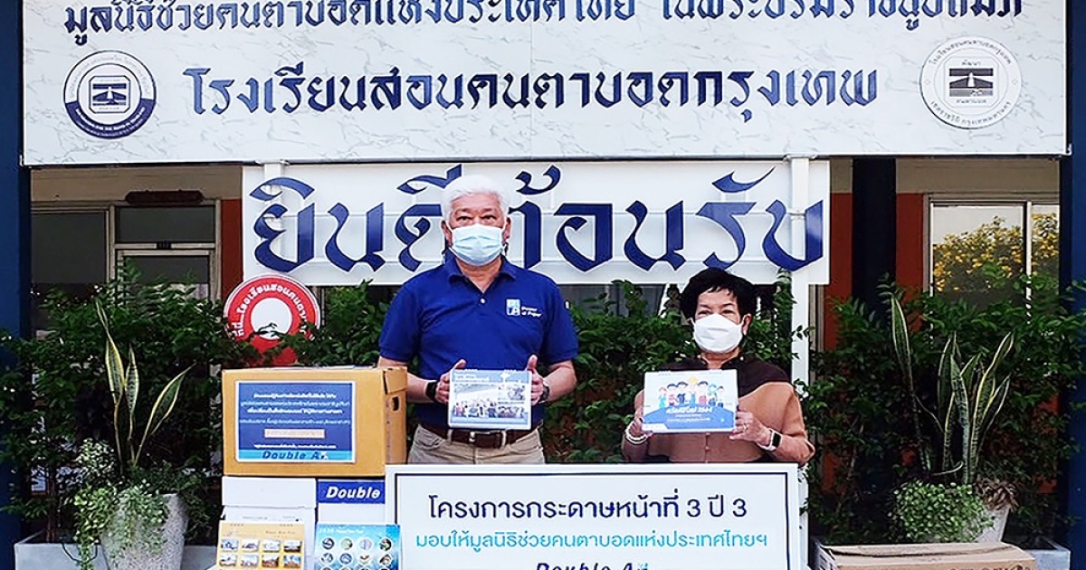 นายชาญวิทย์ จารุสมบัติ รองกรรมการผู้จัดการใหญ่ ดั๊บเบิ้ล เอ มอบปฏิทินเก่าและหนังสือที่ไม่ใช้แล้วแต่สภาพดี ภายใต้โครงการ “กระดาษหน้าที่ 3 ปี 3” จากการร่วมบริจาคของพนักงานดั๊บเบิ้ล เอ เพื่อส่งต่อให้กับมูลนิธิช่วยคนตาบอดแห่งประเทศไทย ในพระบรมราชินูปถัมภ์ สำหรับนำไปจัดทำสื่ออักษรเบรลล์ประกอบการเรียนการสอนของนักเรียนในโรงเรียนสอนคนตาบอดกรุงเทพ โดยมีน.ส. จรัสศรี ศรีมณี ผู้อำนวยการสำนักบริหารมูลนิธิฯ เป็นผู้รับมอบในครั้งนี้