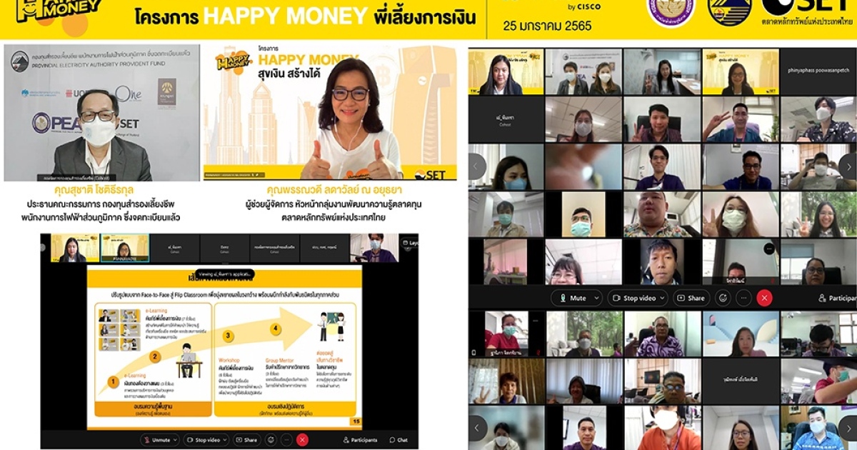 ตลาดหลักทรัพย์แห่งประเทศไทย ร่วมกับการไฟฟ้าส่วนภูมิภาค จัดอบรมโครงการ “Happy Money พี่เลี้ยงการเงิน” แก่บุคลากรและสมาชิกกองทุนสำรองเลี้ยงชีพพนักงานการไฟฟ้าส่วนภูมิภาค ซึ่งจดทะเบียนแล้ว โดยมี สุชาติ โชติธีรกุล ประธานคณะกรรมการกองทุนสำรองเลี้ยงชีพพนักงานการไฟฟ้าส่วนภูมิภาค ซึ่งจดทะเบียนแล้ว และพรรณวดี ลดาวัลย์ ณ อยุธยา ผู้ช่วยผู้จัดการ ตลาดหลักทรัพย์ฯ ร่วมเปิดการอบรมเมื่อ 25 ม.ค. ที่ผ่านมา สร้างพี่เลี้ยงการเงิน 366 คน เพื่อส่งเสริมความรู้ด้านการวางแผนการเงิน พัฒนาทักษะการให้คำแนะนำด้านการเงิน เป้าหมายเพื่อปรับเปลี่ยนพฤติกรรมการใช้จ่าย ให้เกิดการส่งต่อความรู้และสามารถขยายผลได้อย่างยั่งยืน องค์กรที่สนใจเข้าร่วมโครงการ “Happy Money พี่เลี้ยงการเงิน” ของตลาดหลักทรัพย์ฯ ดูรายละเอียดได้ที่ www.set.or.th/happymoney