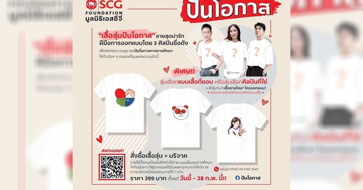 จะดีแค่ไหน ถ้าวันวาเลนไทน์นี้ คุณสามารถ “ส่งความรัก” ได้ “ไม่ใช่แค่หนึ่ง” แต่ยังสามารถ “ส่งต่อความรักให้แก่สังคมได้ด้วย” มูลนิธิเอสซีจี ขอเชิญชวนทุกท่านร่วมเป็นส่วนหนึ่งของกิจกรรมสุดพิเศษ “เสื้อสุ่มปันโอกาส” เพียงร่วมบริจาคเงินซื้อเสื้อในราคาตัวละ 399 บาท สามารถเลือก "สุ่มลายเสื้อ" หรือ" สุ่มเลือก ศิลปิน" ที่มาร่วมออกแบบได้ มิว ศุภศิษฏ์ - มุก วรนิษฐ์ - แพท พาวเวอร์แพท รายได้ทั้งหมดโดยไม่หักค่าใช้จ่าย มอบเป็นทุนการศึกษาเพื่อแบ่งปันโอกาสให้กับน้องๆ ที่ผู้ปกครองได้รับผลกระทบจากโควิด-19 และขาดแคลนทุนทรัพย์ ได้มีโอกาสเรียนต่อ เพื่อเป็นอนาคตที่ดีของสังคมต่อไป