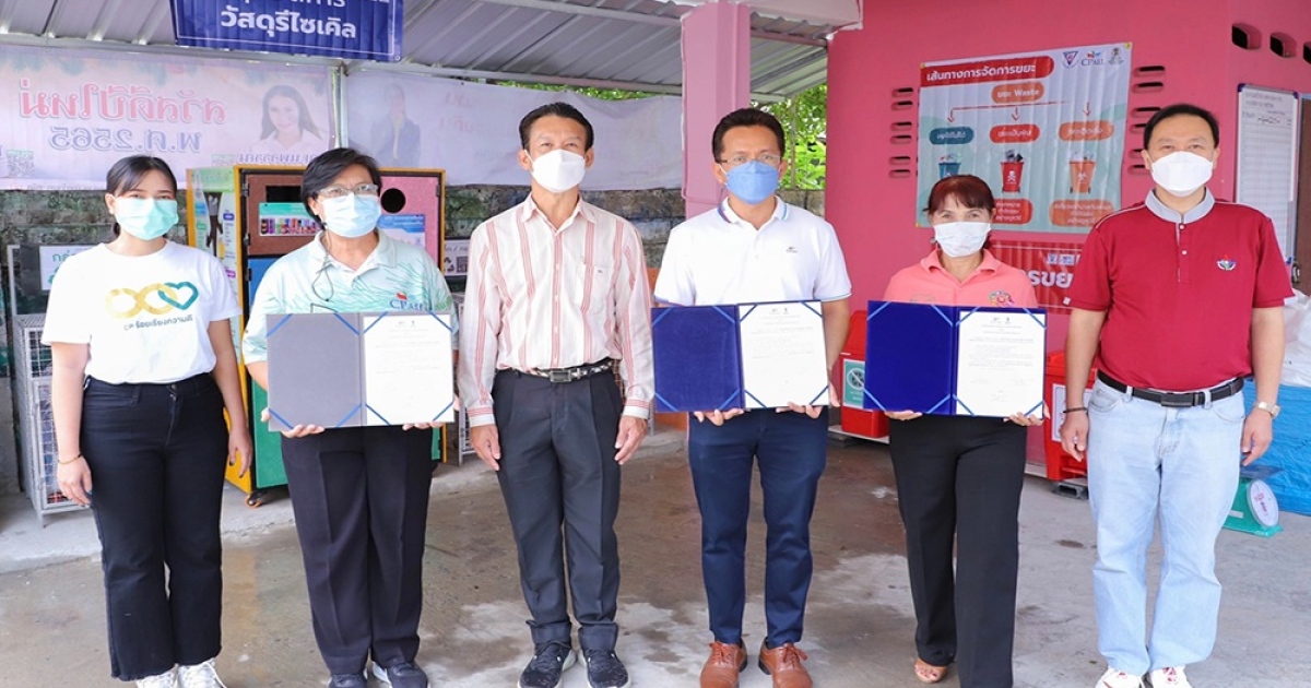 นายสุขุม อังอนันท์ (ที่ 3 จากซ้าย) ผู้ช่วยผู้อำนวยการเขตบางเขน ร่วมเป็นสักขีพยานในพิธีลงนามบันทึก ข้อตกลง (MOU) “ชุมชนไร้ถัง” ระหว่าง นายตรีเทพ ปาลกะวงศ์ ณ อยุธยา (ที่ 4 จากซ้าย) ประธานคณะทำงานโครงการ สานอนาคตการศึกษา CONNEXT ED บมจ.ซีพี ออลล์ ผู้บริหารร้านเซเว่น อีเลฟเว่น และเซเว่น เดลิเวอรี่ ร่วมกับ นางสาว วรรณิศา หงันเปี่ยม (ที่ 5 จากซ้าย) ประธานชุมชนบ้านมั่นคงชุมชนบางบัว พร้อมด้วย นางสาวสุดารัตน์ สังข์ฤทธิ์ (ที่ 2 จากซ้าย) ที่ปรึกษาโรงเรียนอนุบาลทับสะแก จ.ประจวบคีรีขันธ์ ผู้ดูแลโครงการ “ต้นกล้าไร้ถัง” หนึ่งในโครงการต้นแบบภายใต้โครงการ CONNEXT ED CP ALL พร้อมเปิดให้บริการธนาคารขยะ และศูนย์จัดการขยะชุมชนบ้านมั่นคงชุมชนบางบัว เพื่อแก้ไขปัญหาขยะในพื้นที่ชุมชน และสร้างองค์ความรู้ในการจัดการขยะที่ถูกต้องและยั่งยืน ด้วยปณิธาน ร่วมสร้างสรรค์ และแบ่งปันโอกาสต่อกัน ณ ศูนย์เรียนรู้บ้านมั่นคงชุมชนบางบัว เมื่อเร็ว ๆนี้